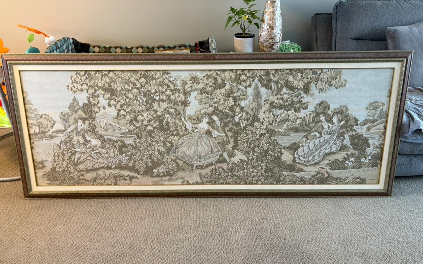 44Selling a framed toile print. It features a pastoral scene with figures in a garden or park setting. The frame is a dark wood colour. It would look great in any room!