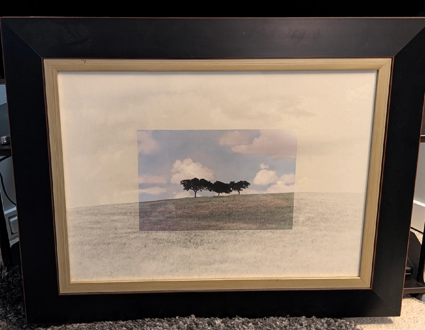 21A framed print featuring a serene landscape with trees. The frame is black with a gold accent. Perfect for adding a touch of nature to your home decor