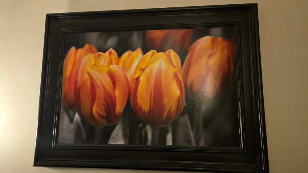 A lovely framed art print featuring vibrant orange tulips against a black and white background. The frame is a sleek black colour. Perfect for adding a pop of colour to your home decor! Measurements for the frame are: 43 inch long by 31 inch wide, with inner being 35 inch long and 23 inch wide.