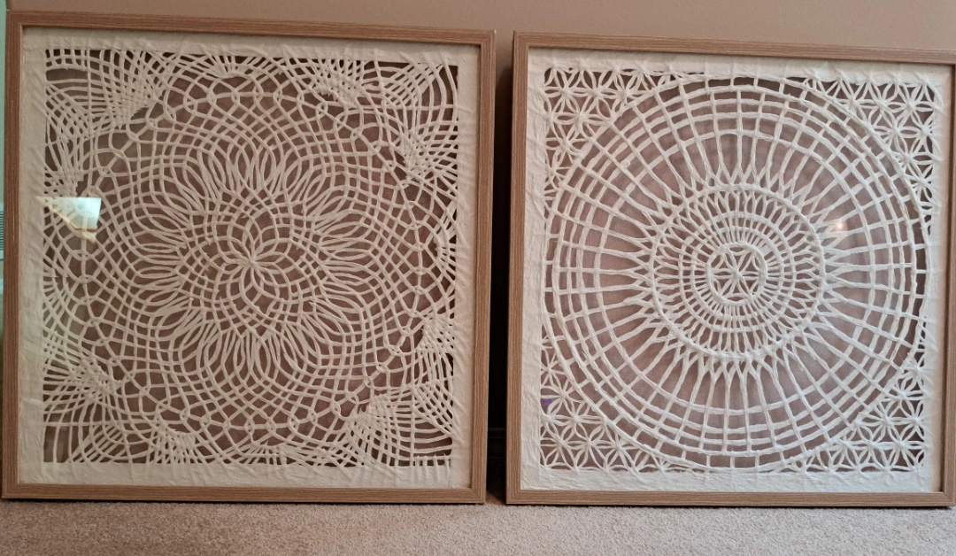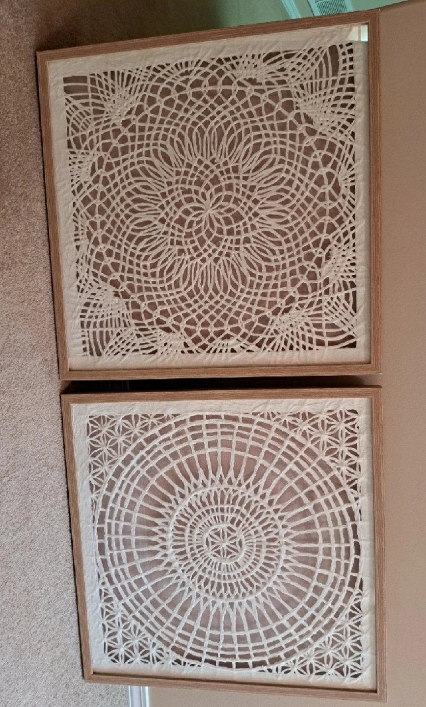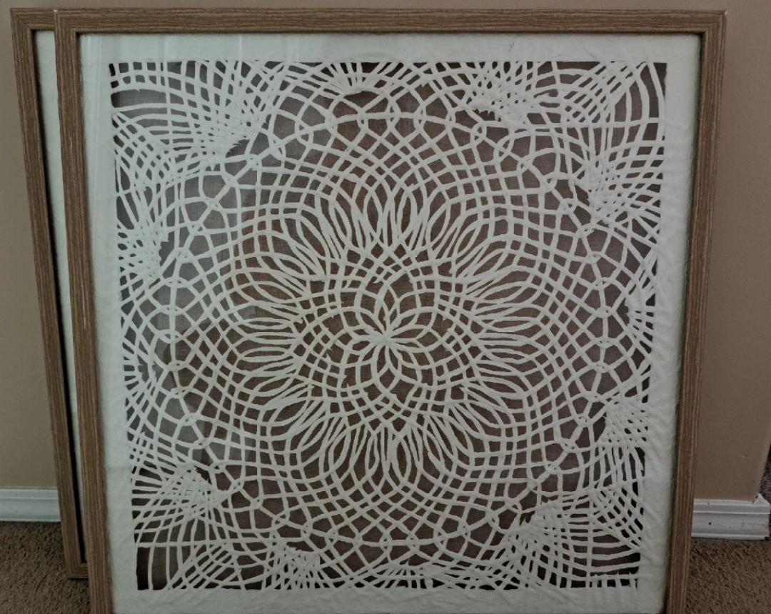 Selling a set of two framed wall art pieces. They have intricate designs and a neutral colour palette (cream on taupe) that would complement any room. They are in great condition and ready to hang up!