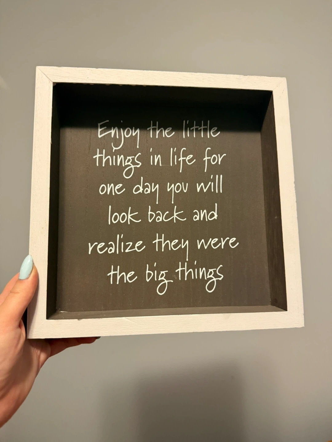 This framed wall decor piece features the saying "Enjoy the little things in life for one day you will look back and realize they were the big things" It's a nice reminder and would look great in any room of the house