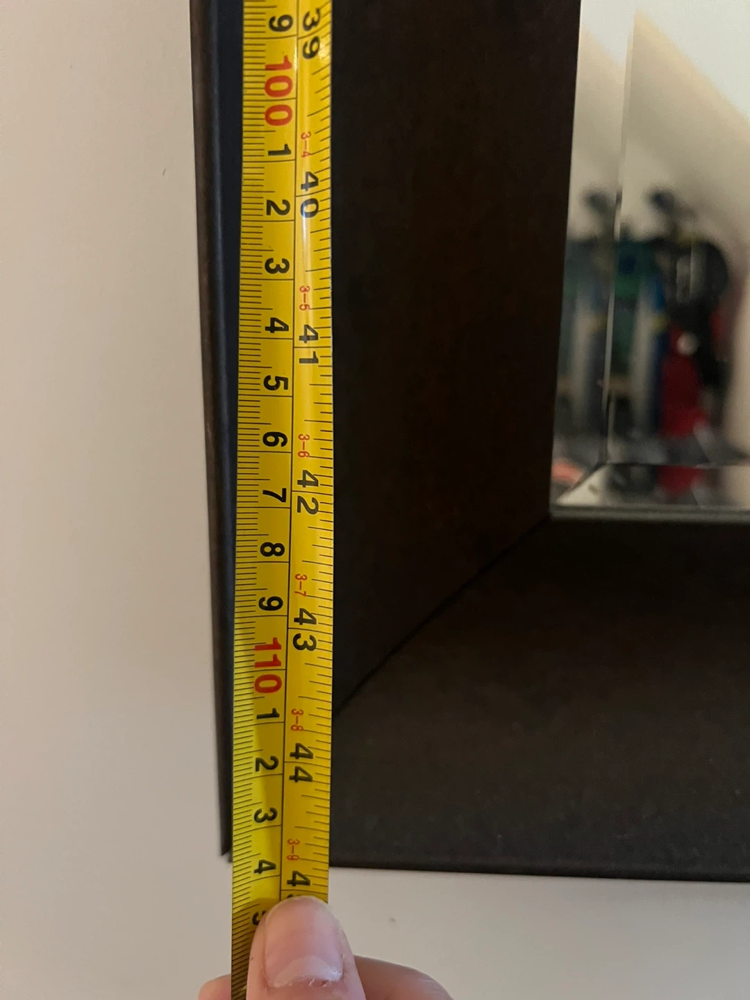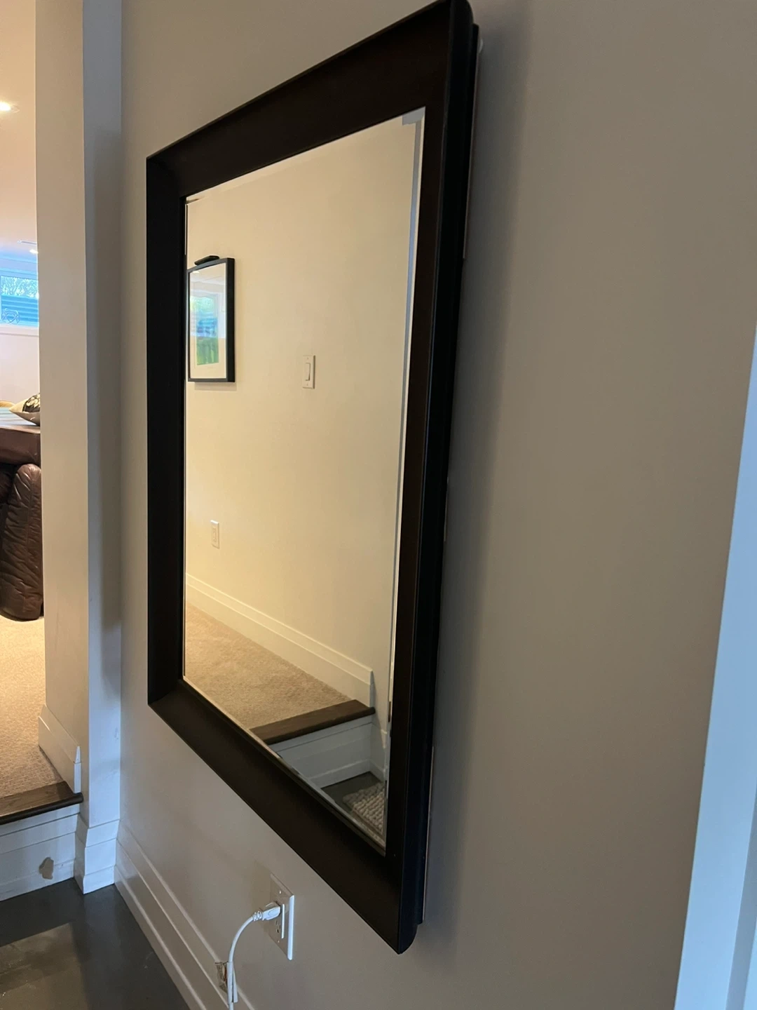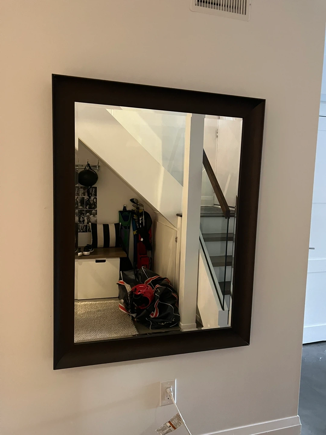 Selling a framed wall mirror. It measures approximately 44 inches in height and 35 inches in width. It's in great shape and ready to brighten up your space!
