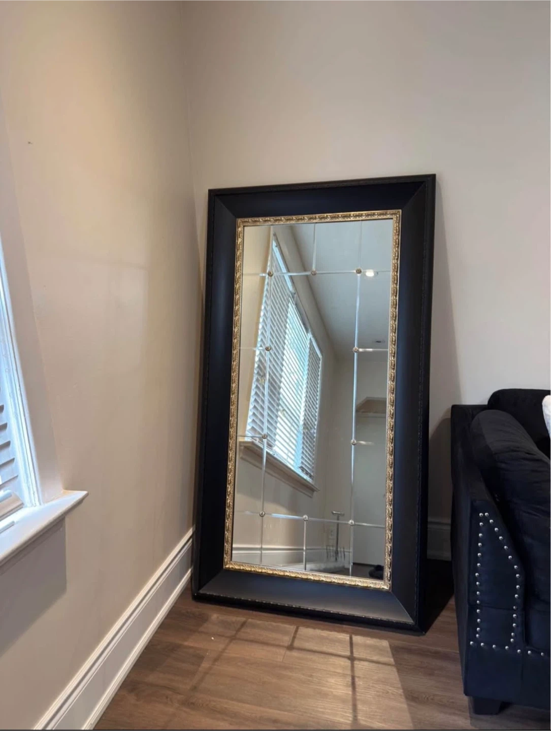 16Here's a lovely framed wall mirror that would look great in any room! It features a black frame with gold accents. The mirror is in great condition and ready to be hung up in your home. It's a stylish piece that will add a touch of elegance to your decor