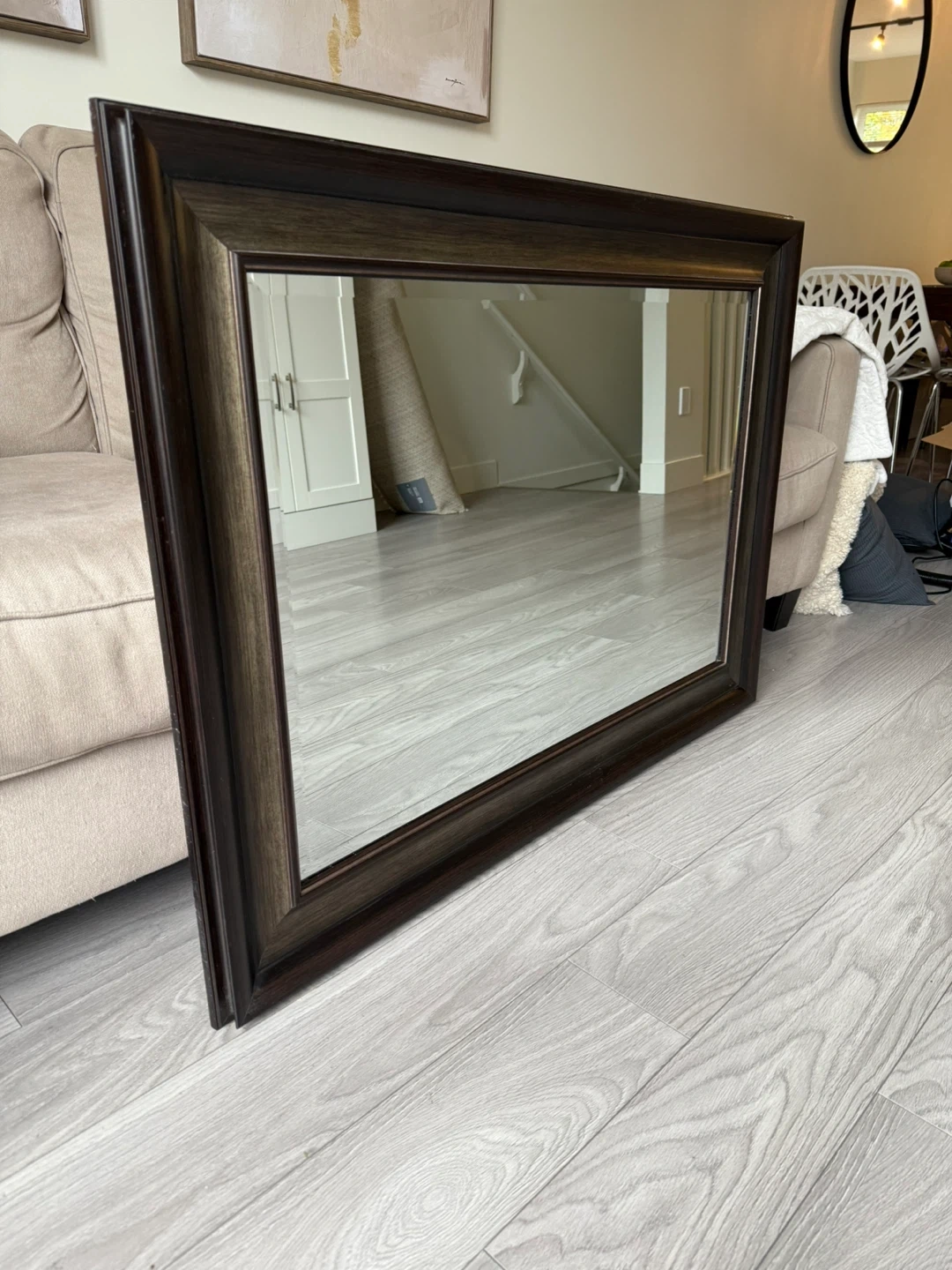 10Selling a framed wall mirror with a brown finish. It's in great condition and would look lovely in any room! The frame has a classic design that complements various decor styles. It's ready to be hung and brighten up your space.