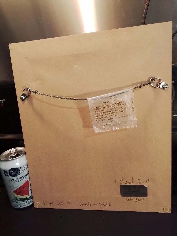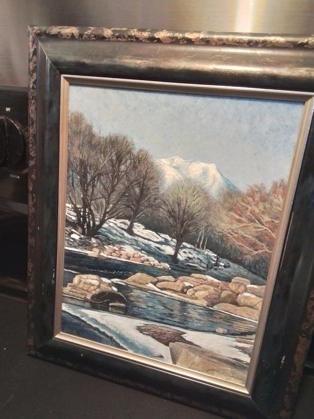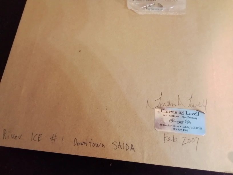 114Framed Winter Landscape Painting by Jack Chivvis "River Ice #1, Downtown Salida" Original artwork. Winter scene. Mountain view. Bare trees. Rocky river. Framed. Signed and dated Feb. 2007. https://chivvisandlovell.com/ Salida, Colorado Winter Lake scene measures 13" x 11" Pickup at Young Street and Steels Ave