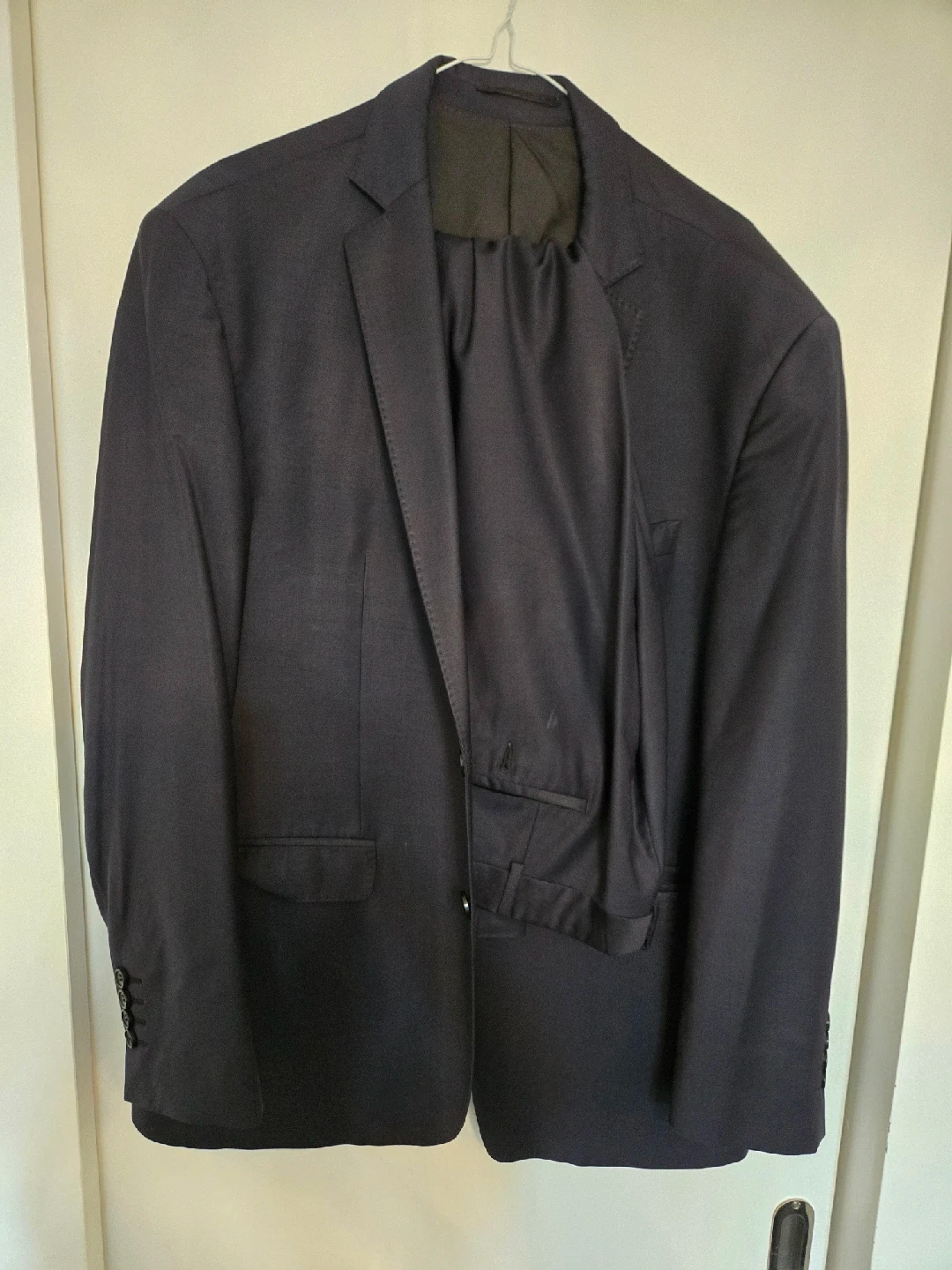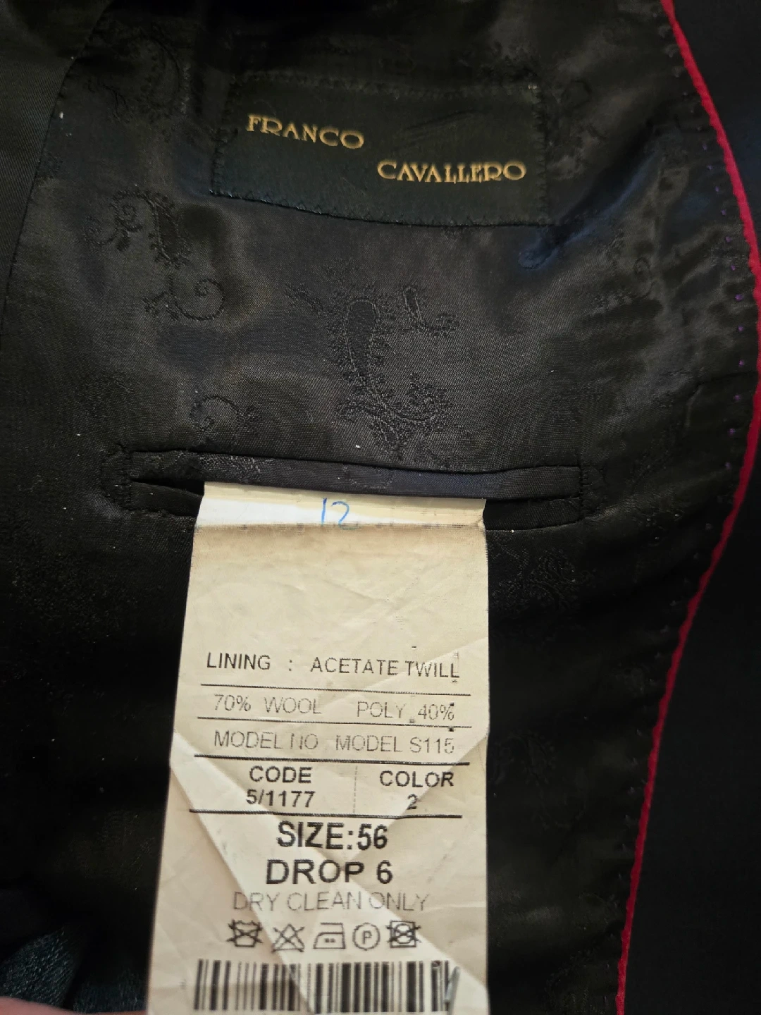 81Navy Franco Cavallero suit in size 56. The lining is acetate twill with 70% wool and 40% poly. Dry clean only