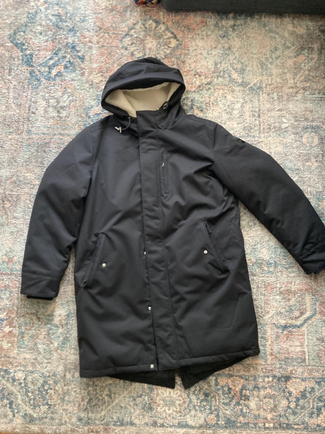 96Like new men’s parka. Work a few times. Changed my mind on what style I wanted. Rated for -10 to -25 Celsius. Cruelty free, recycled polyester, down-like filling.