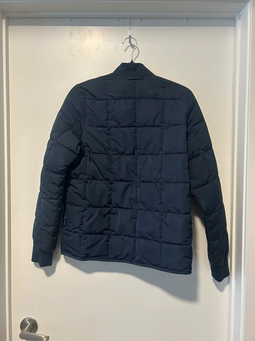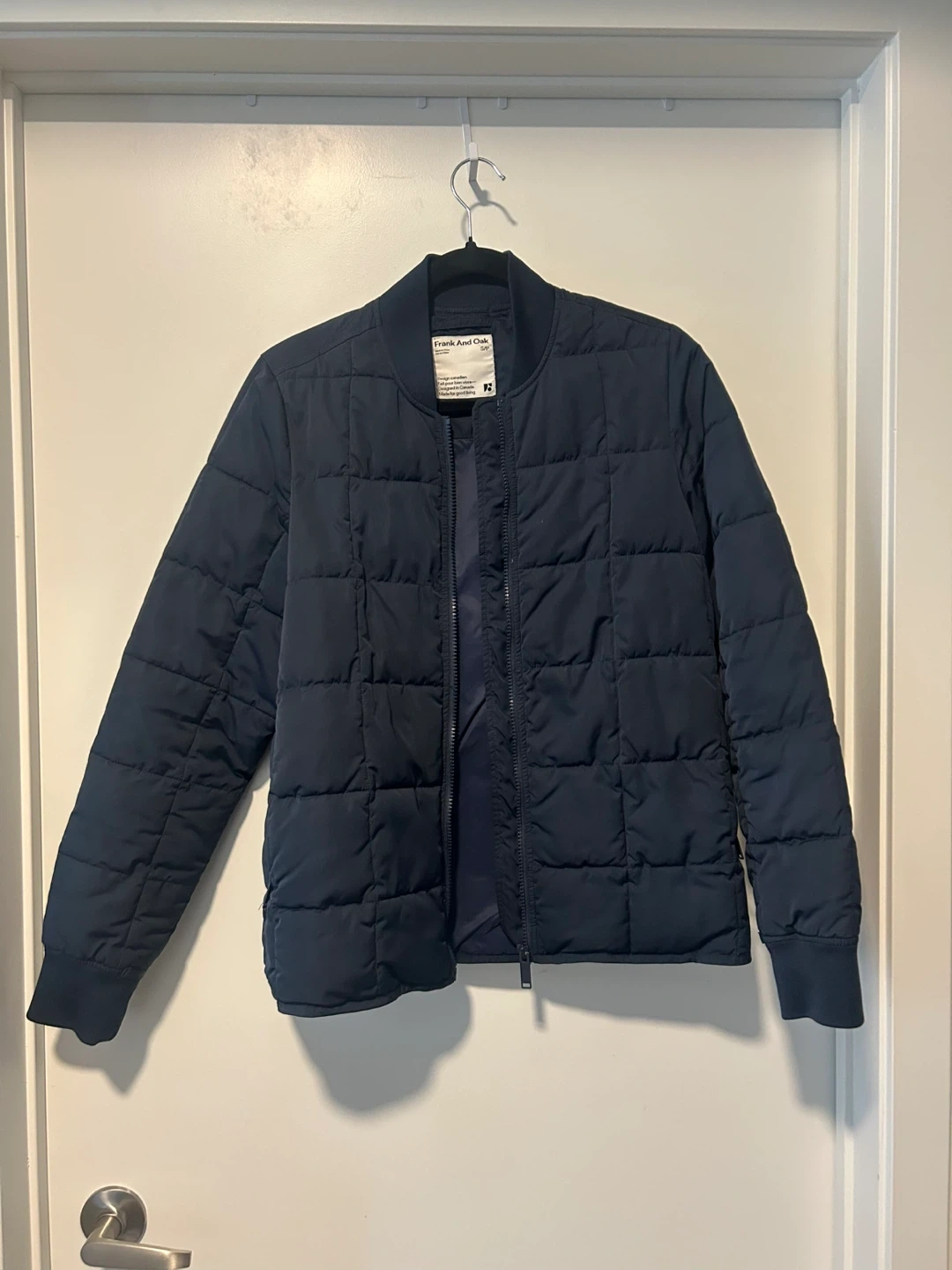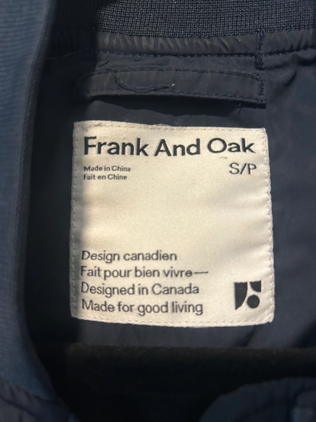 272Canadian-made bomber, size small. Lightly used, navy coloured, and is the perfect transition jacket. RIP Frank & Oak 🥲 their retail stores have all closed amid financial difficulty and supply chain issues.