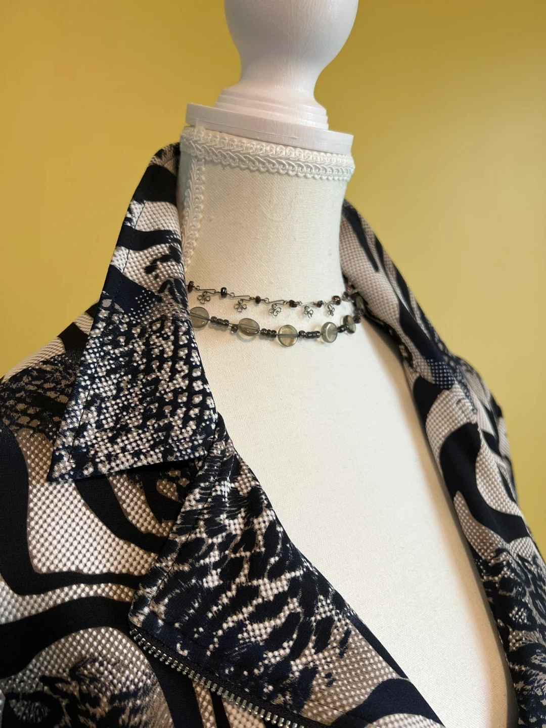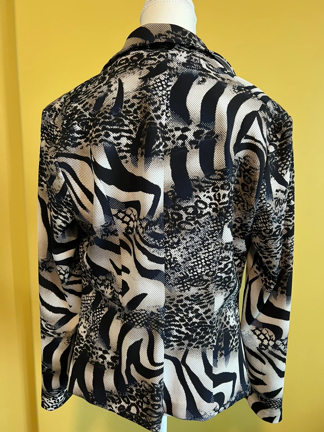 FRANK LYMAN Montreal Jacket — mixed print of black, gray and white. Hand washable. Front closure hook. Made in Canada. Fits a size 8 to 10. NEW —the price is firm