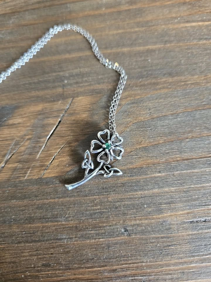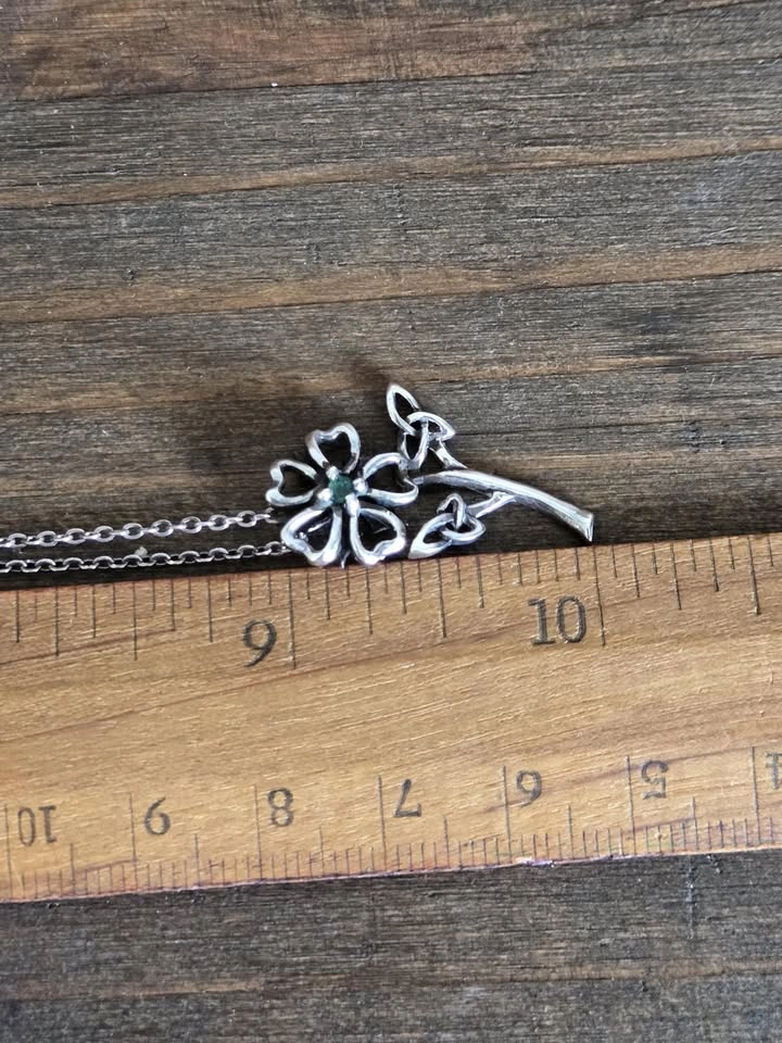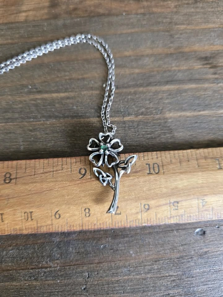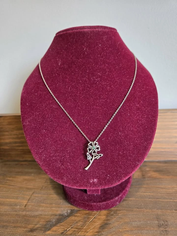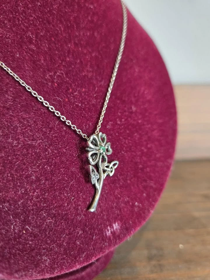 0Sweet little pendant necklace made by the Franklin Mint, marked FM83 STERLING 925. The pendant is a Tudor style five petal rose with a tiny faceted emerald set in the center. On the stem are two leaves in the shape of tri-point celtic knots. The chain is also marked 925 and is 18". Excellent vintage condition, there is some patina. The pendant is 1" long by 3/4" wide. Pick up in Beaumont.
