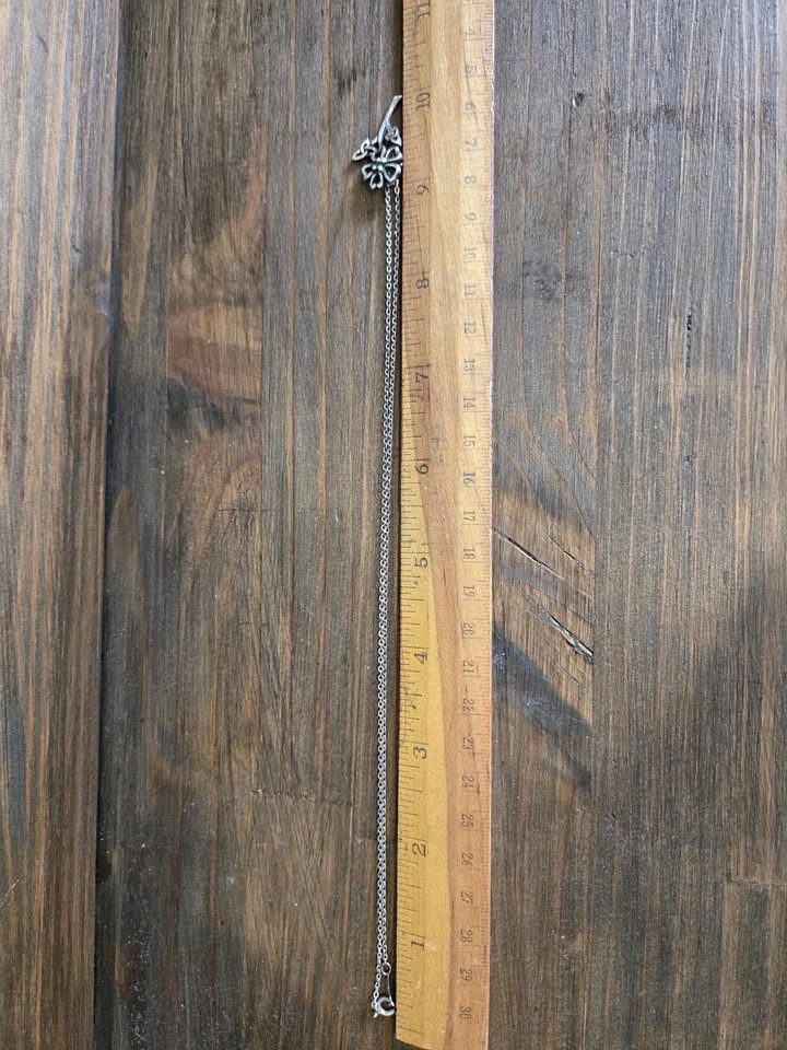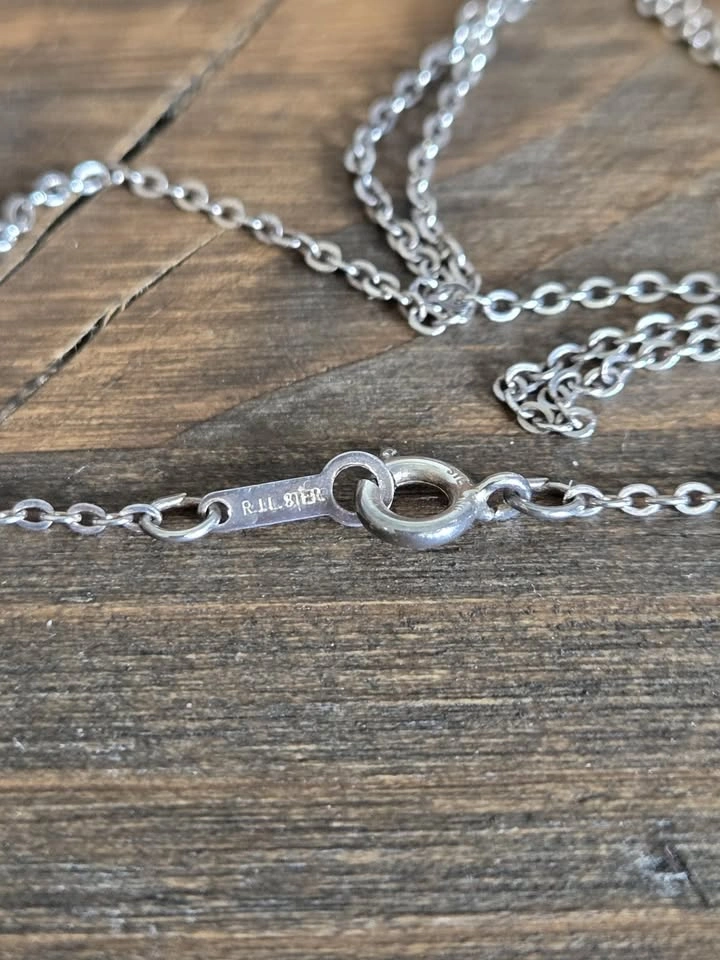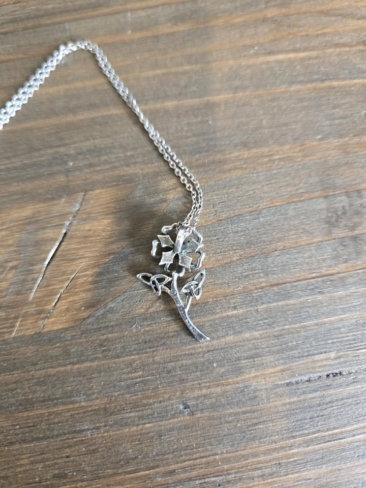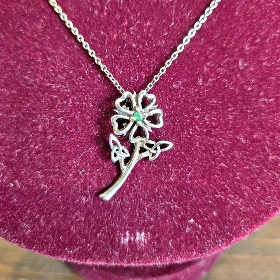 0Sweet little pendant necklace made by the Franklin Mint, marked FM83 STERLING 925. The pendant is a Tudor style five petal rose with a tiny faceted emerald set in the center. On the stem are two leaves in the shape of tri-point celtic knots. The chain is also marked 925 and is 18". Excellent vintage condition, there is some patina. The pendant is 1" long by 3/4" wide. Pick up in Beaumont.