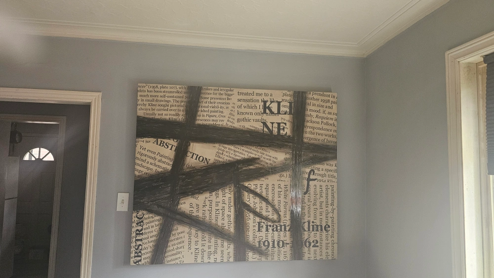 Selling a Franz Kline abstract art print. It features a newspaper print background with black painted lines. A unique piece to add to your art collection