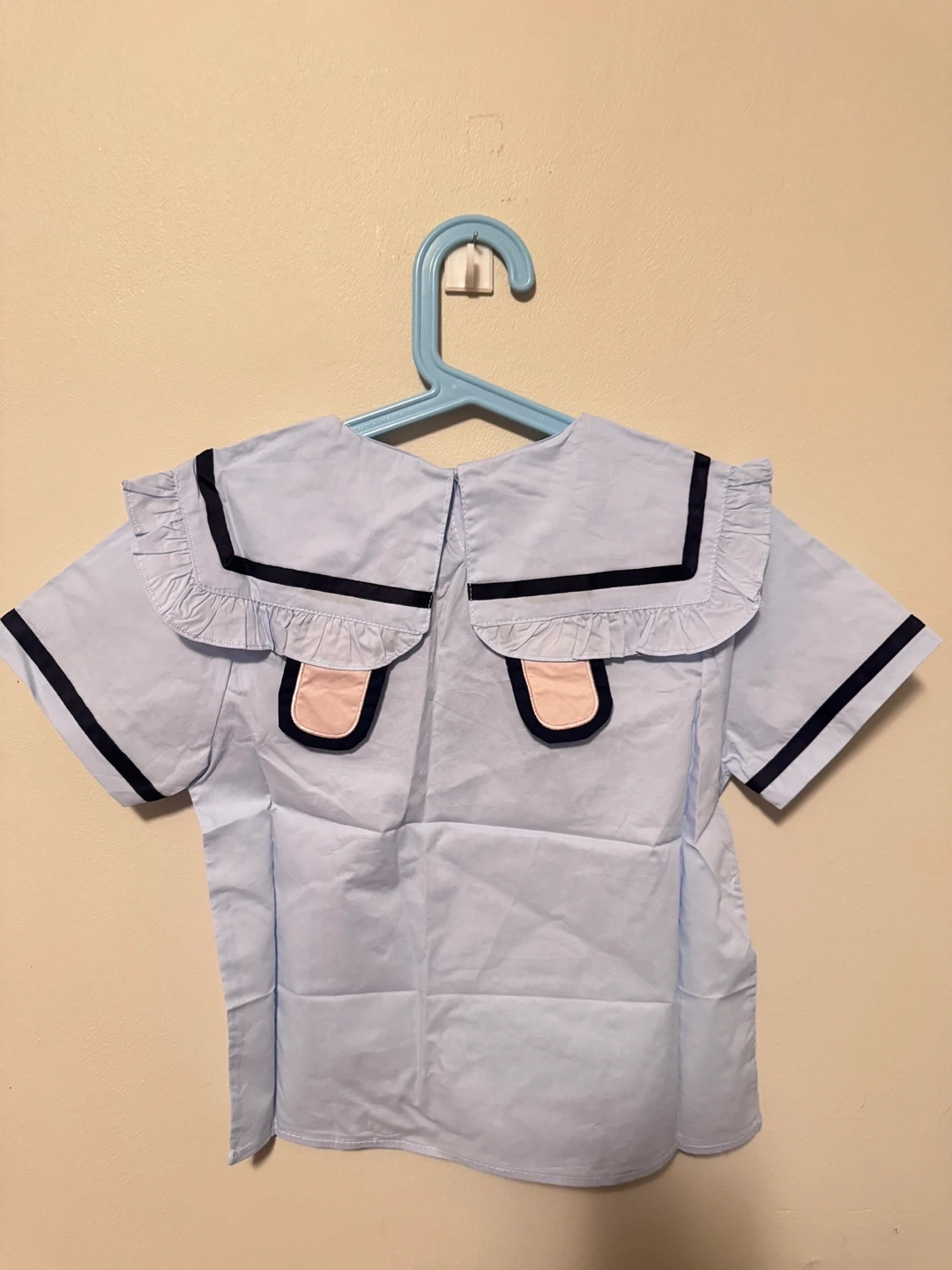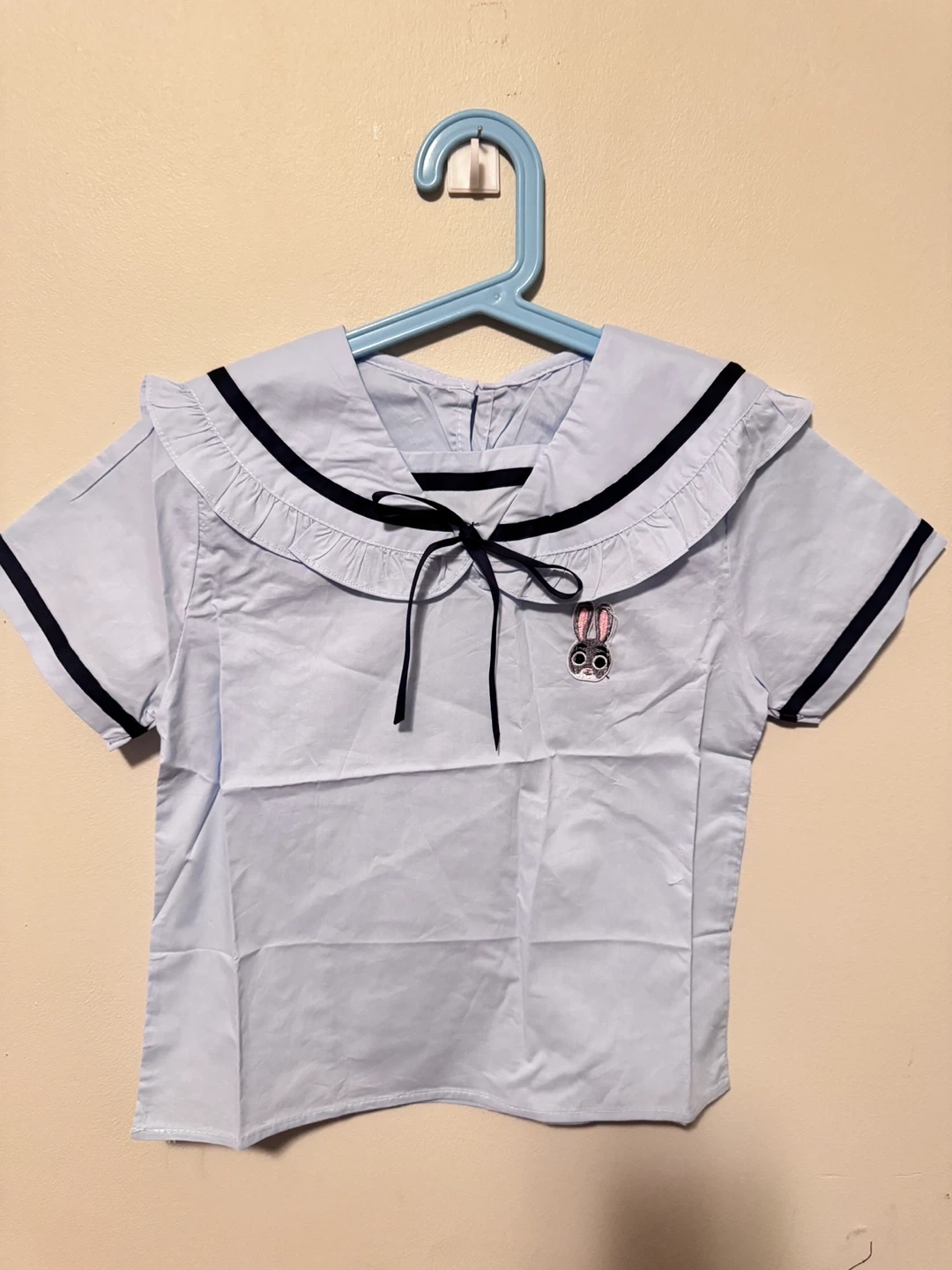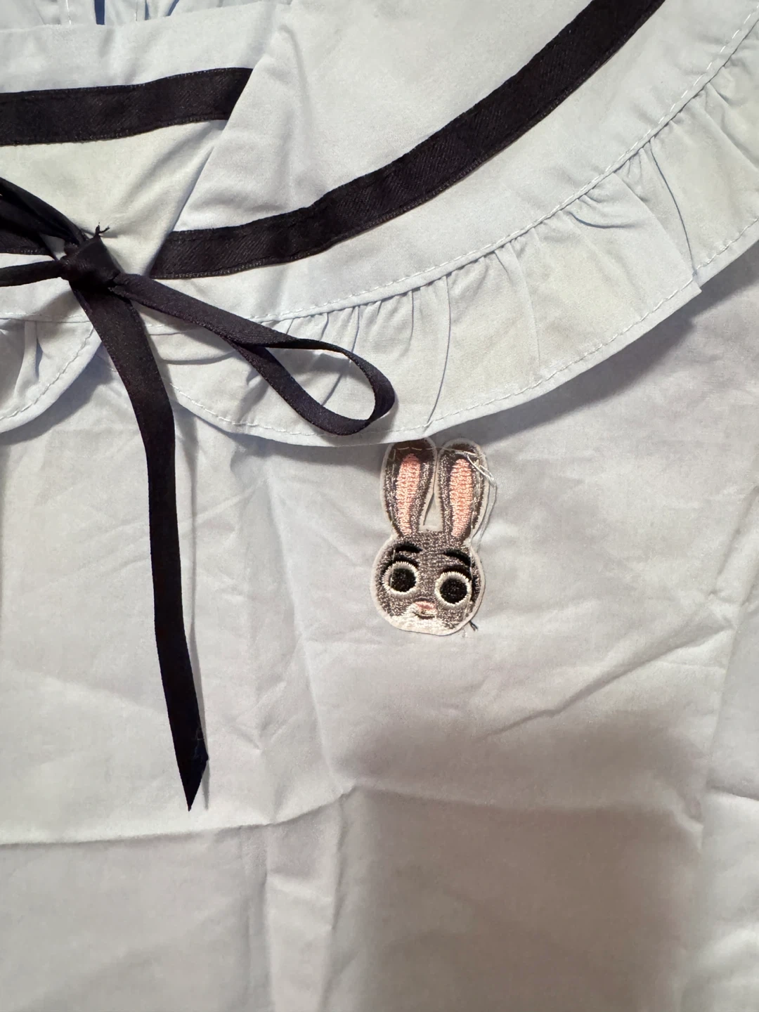 Adorable light blue short-sleeved top with a Peter Pan collar and navy trim. It has a cute Zootopia Judy patch embroidered on the front and a playful ribbon tie at the neck. Made from a comfortable, breathable fabric. Perfect for a fun, casual look!