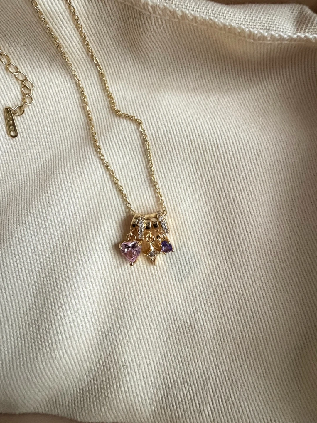 Selling a cute gold necklace! It features three charms: two heart-shaped charms in pink and purple, and a small diamond-like charm in the middle. It's in great condition and would be a lovely addition to any outfit