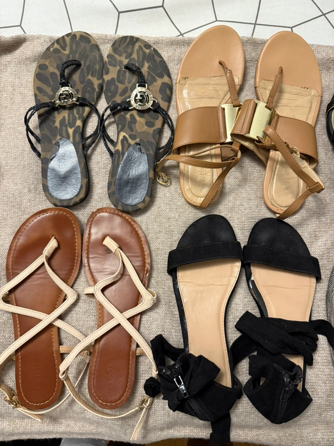 Selling a collection of women's sandals in various styles and brands! There's a pair of Guess flip-flops with a leopard print, some tan sandals with gold buckle details, Express sandals with a criss-cross design, and black tie-up sandals. All are in good used condition and ready for a new home