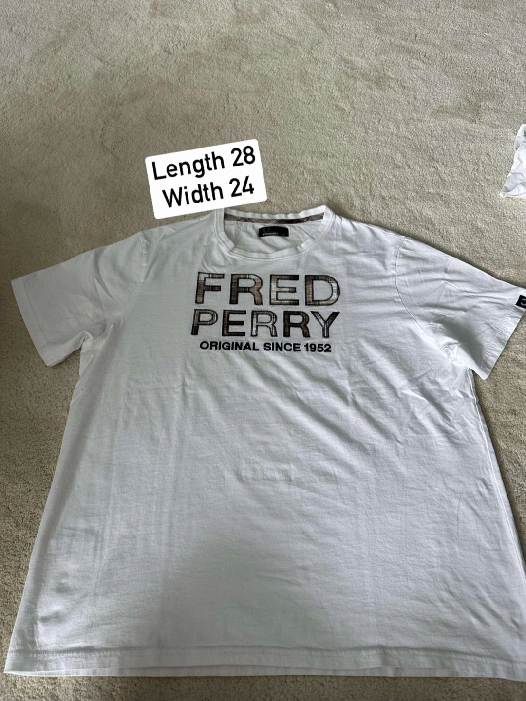 Selling a Fred Perry white T-shirt. The shirt has the brand name across the chest, and it says 'Original Since 1952'. The dimensions are: - Length: 28 inches - Width: 24 inches