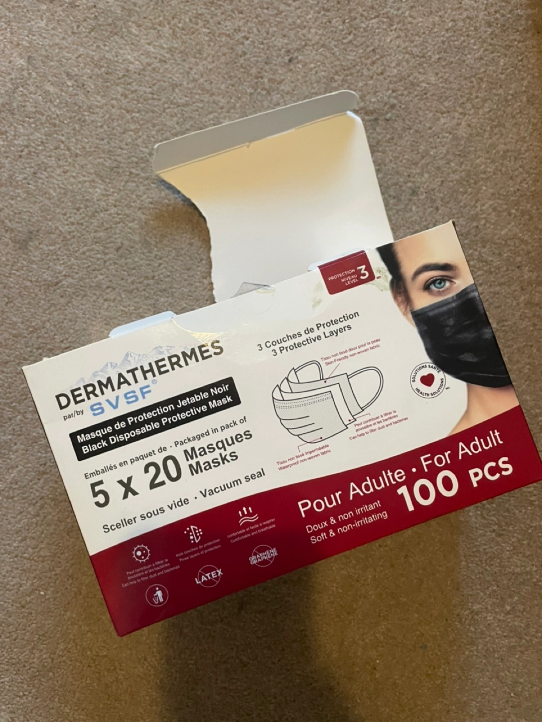 To give- a box of DERMATHERMES Black Disposable Protective Masks. It's packaged in a pack of 5 x 20 masks, totaling 100 pieces for adults. (Some are gone) These masks have 3 protective layers and are soft and non-irritating, made with waterproof non-woven fabric. They can help to filter dust and bacterias.