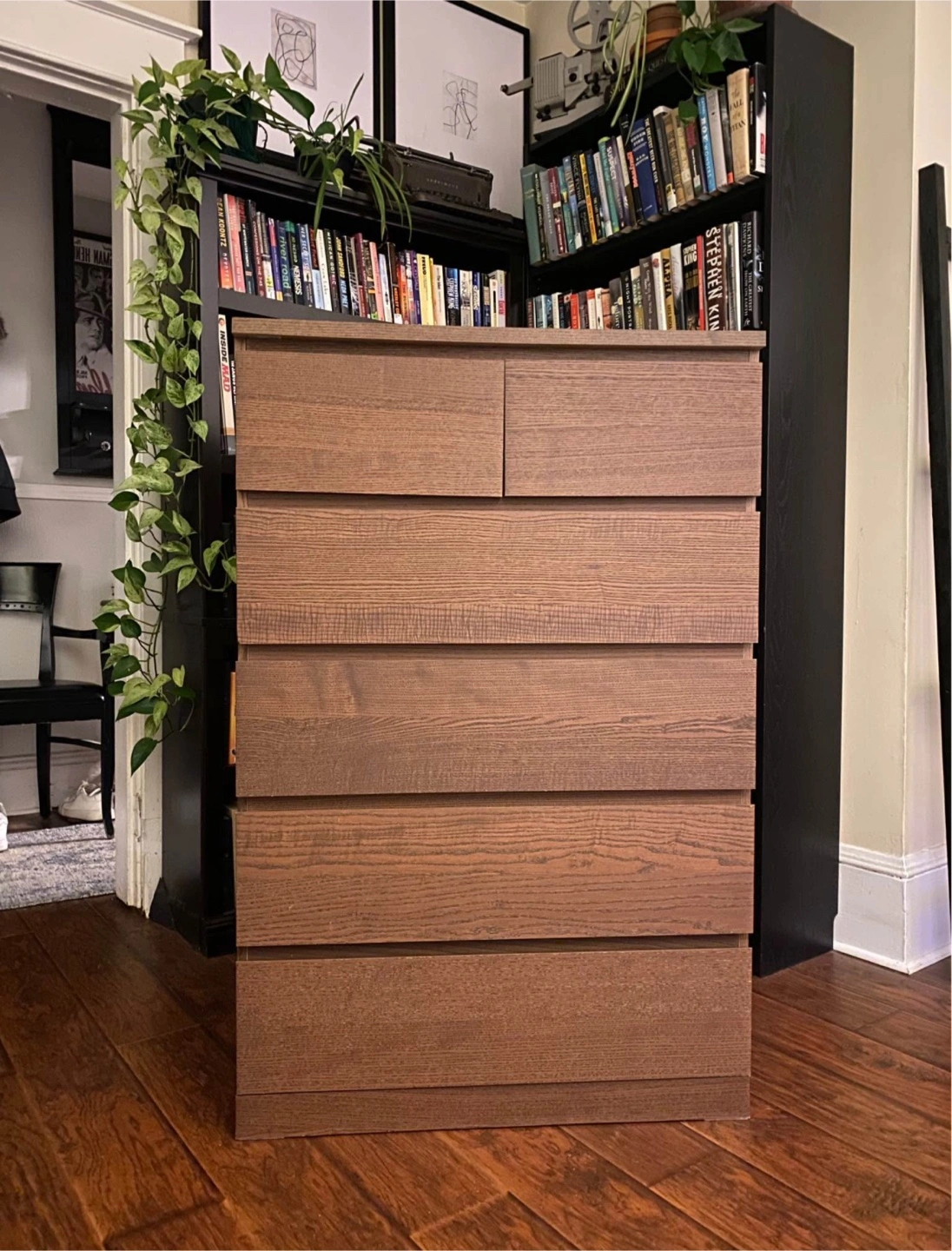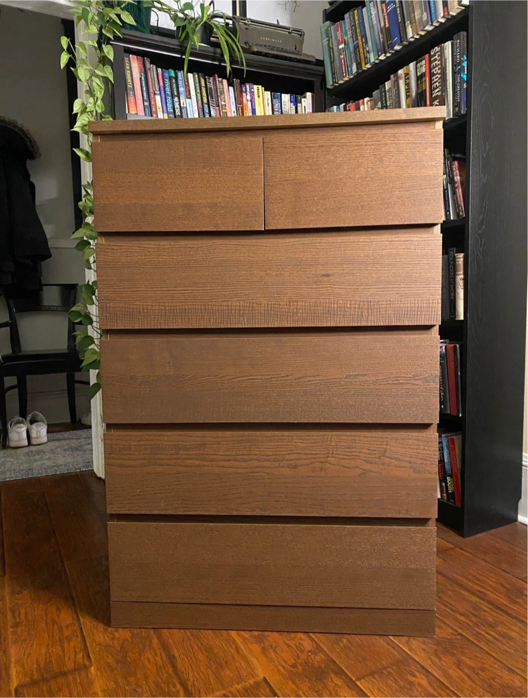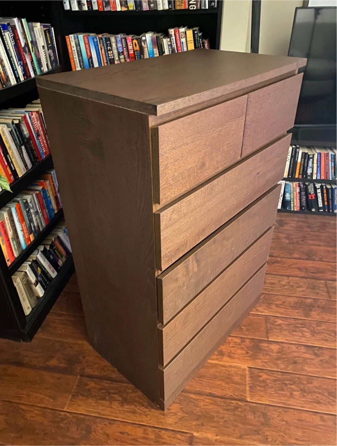 81Brown tall boy dresser in modern styling. Excellent shape, like new, which also would save you a couple hours not needing to assemble! All the drawers work perfectly. Drawers stop when fully retracted. All the drawers are clean. From a smoke-free / pet-free household. No odours. Delivery is included in the price, available throughout HRM. $180 Exact Measurements: Height: 48.5 inches (or 4 FT & 0.5 inches). Width: 31.6 inches (or 2 FT & 7.6 inches). Depth: 19 inches (or 1 FT & 7 inches). Fine print: Delivery Only. Free delivery within HRM only. Item is released from secure storage. Right to refuse on delivery. This item includes delivery/handling by 2 people to carefully place it where you ask.