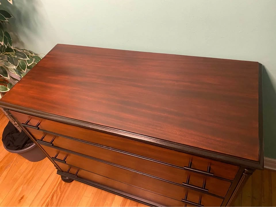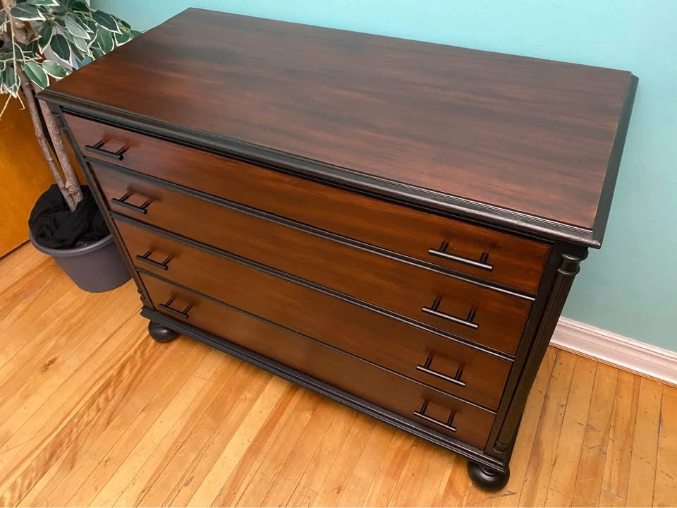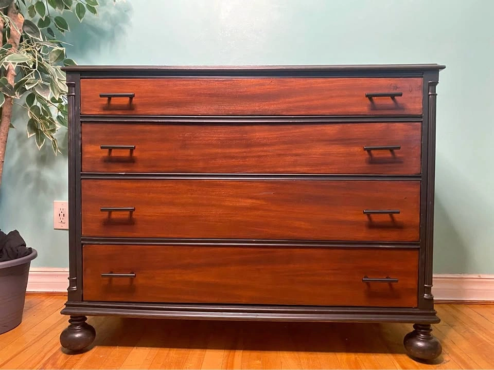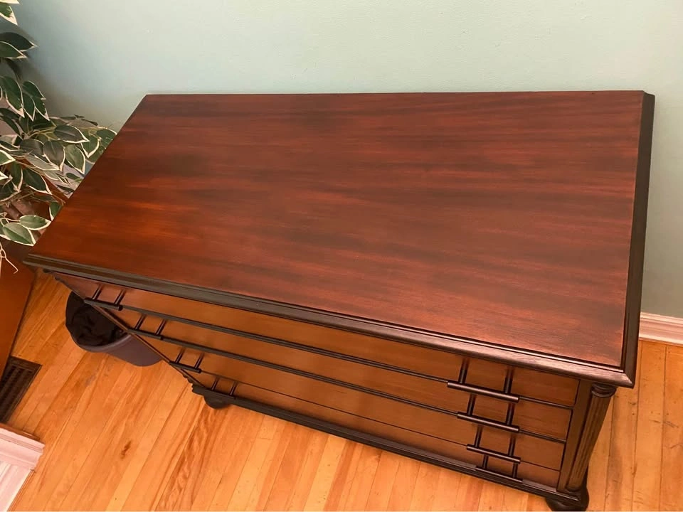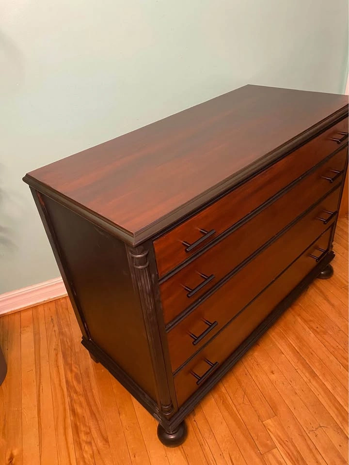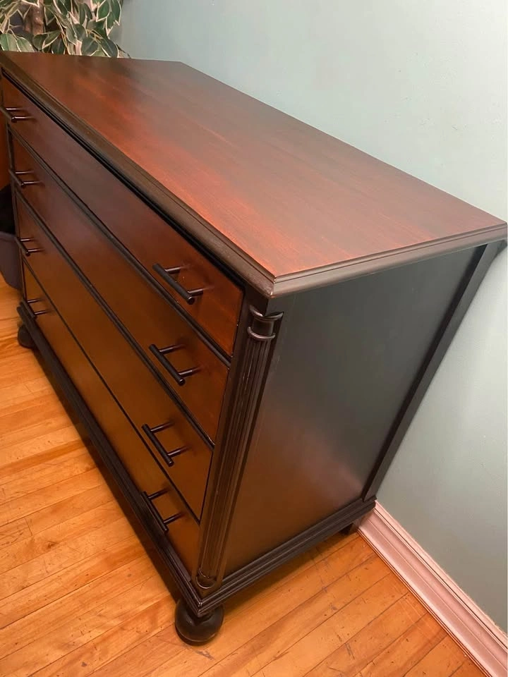 81Gorgeous dresser with a fully refinished exterior. Glossy seal for an excellent barrier from scuffs and liquids. The real mahogany hardwood provides strength and a beautiful grain. Smoke-free / pet-free household, no odours. All the drawers work perfectly without issue. New ergonomic handles for easy drawer movement. Drawer tracks are treated with silicone oil for a long life of smooth movement. Delivery is included in the price, available throughout HRM. Please inspect on delivery to verify that it matches the description and would be to your expectations. Right to refuse on delivery. $350 Exact Measurements: Height: 34.25 inches (or 2 FT & 10.25 inches). Width: 44 inches (or 3 FT & 8 inches). Depth: 20 inches (or 1 FT & 8 inches).
