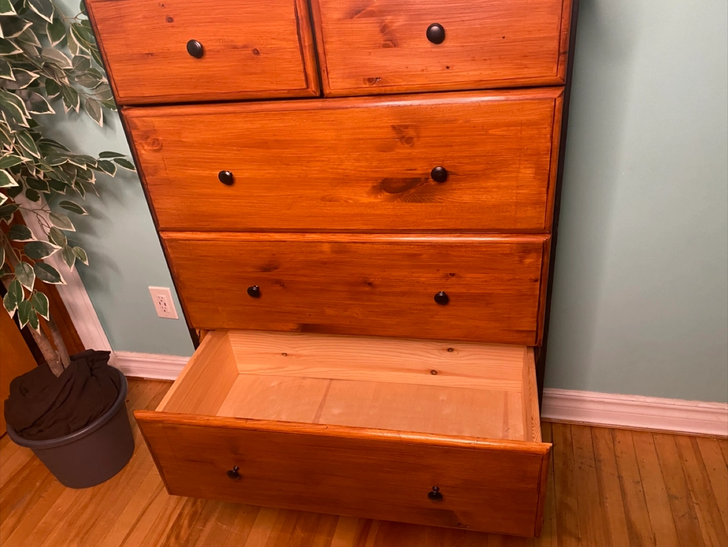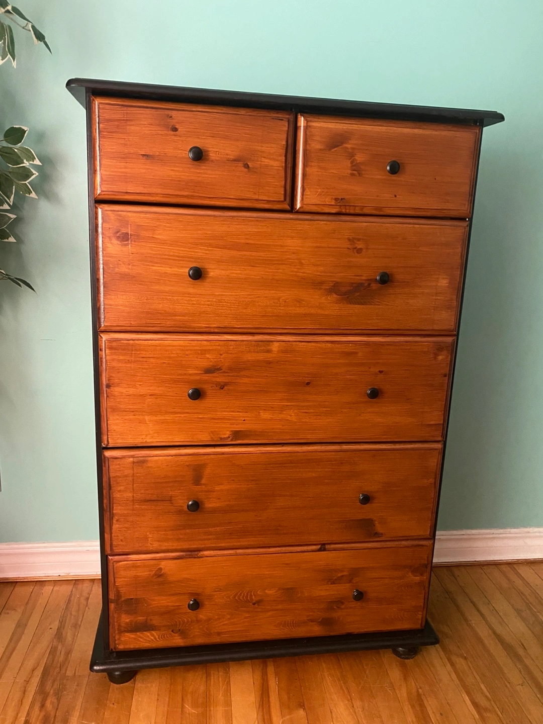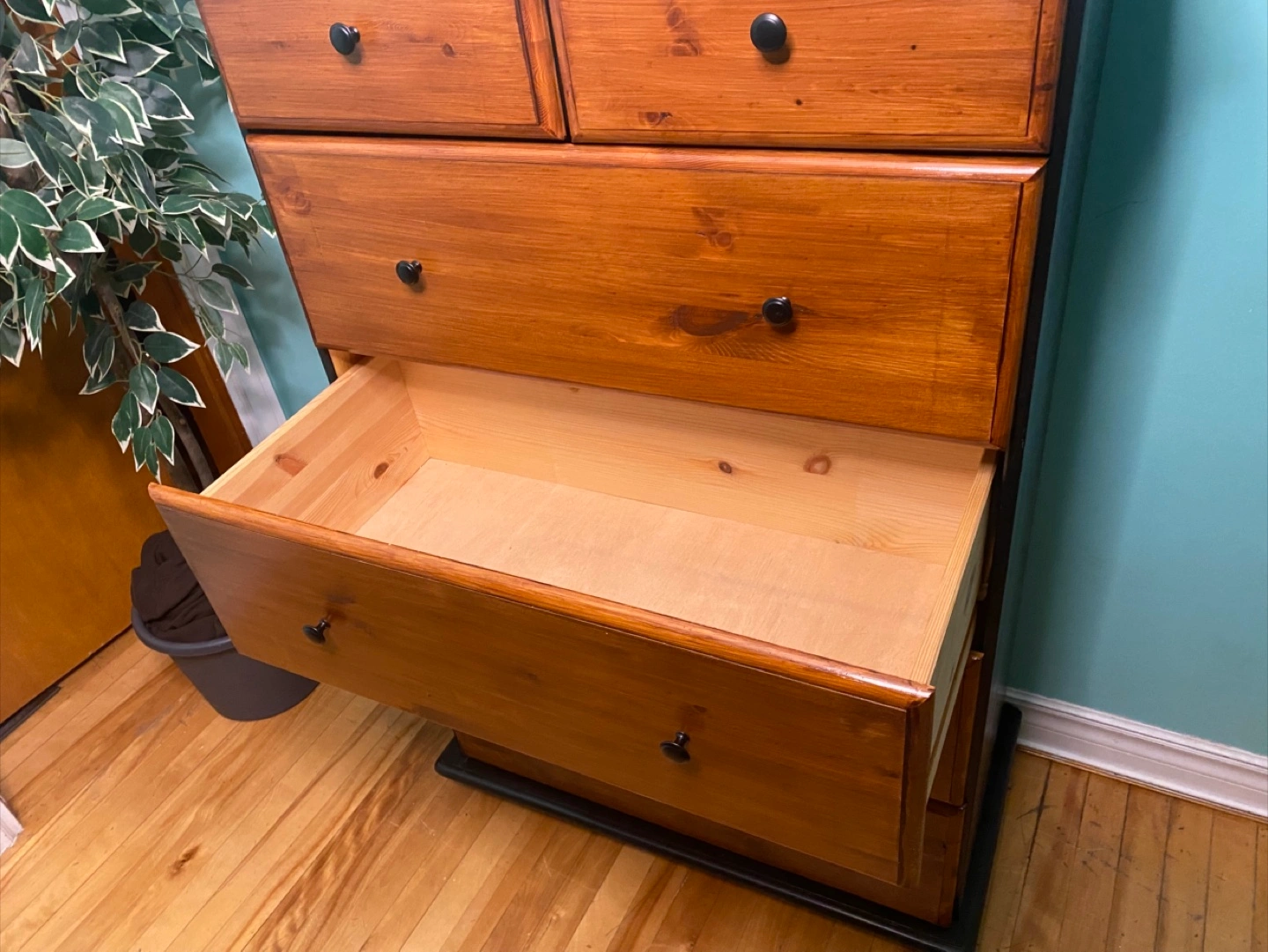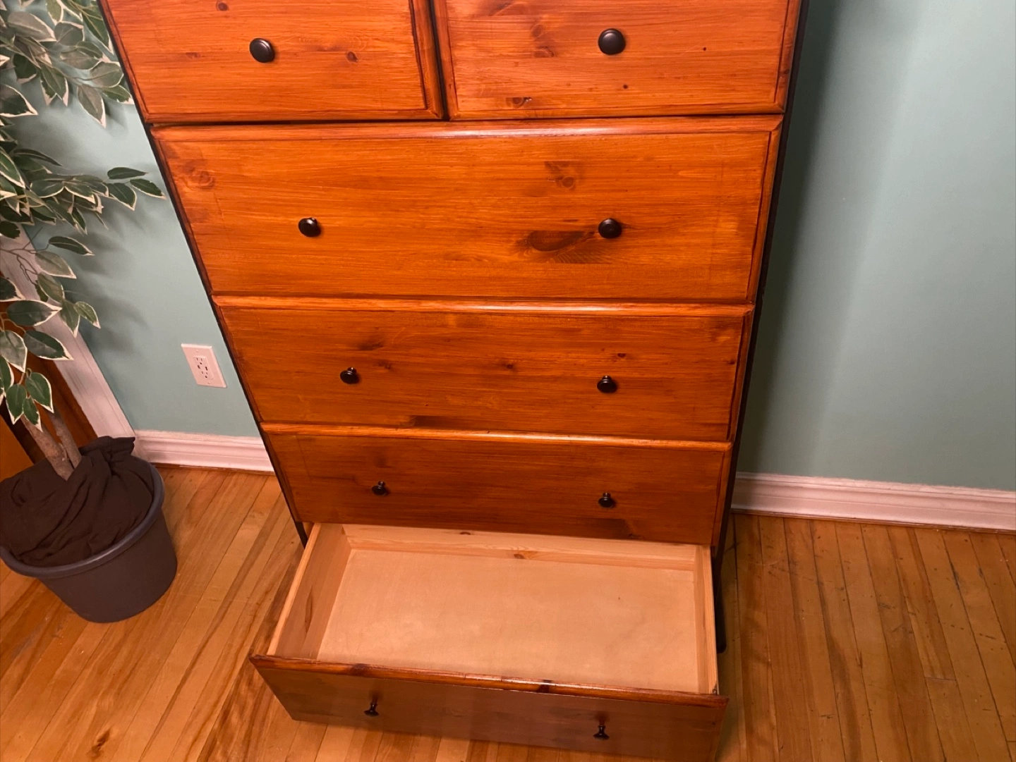 Tall and spacious dresser in excellent shape. Modern styling. Looks like new. Made from real pine wood. The exterior is completely refinished. Drawers open and close smoothly. Smoke-free / pet-free household with no odours. Delivery is included in the price, available throughout HRM. $200 Exact Measurements: Height: 52.75 inches (or 4 FT & 4.75 inches). Width: 33.75 inches (or 2 FT & 9.75 inches). Depth: 17.125 inches (or 1 FT & 5.125 inches). Fine print: Delivery Only. Free delivery within HRM only. Item is released from secure storage. Right to refuse on delivery.