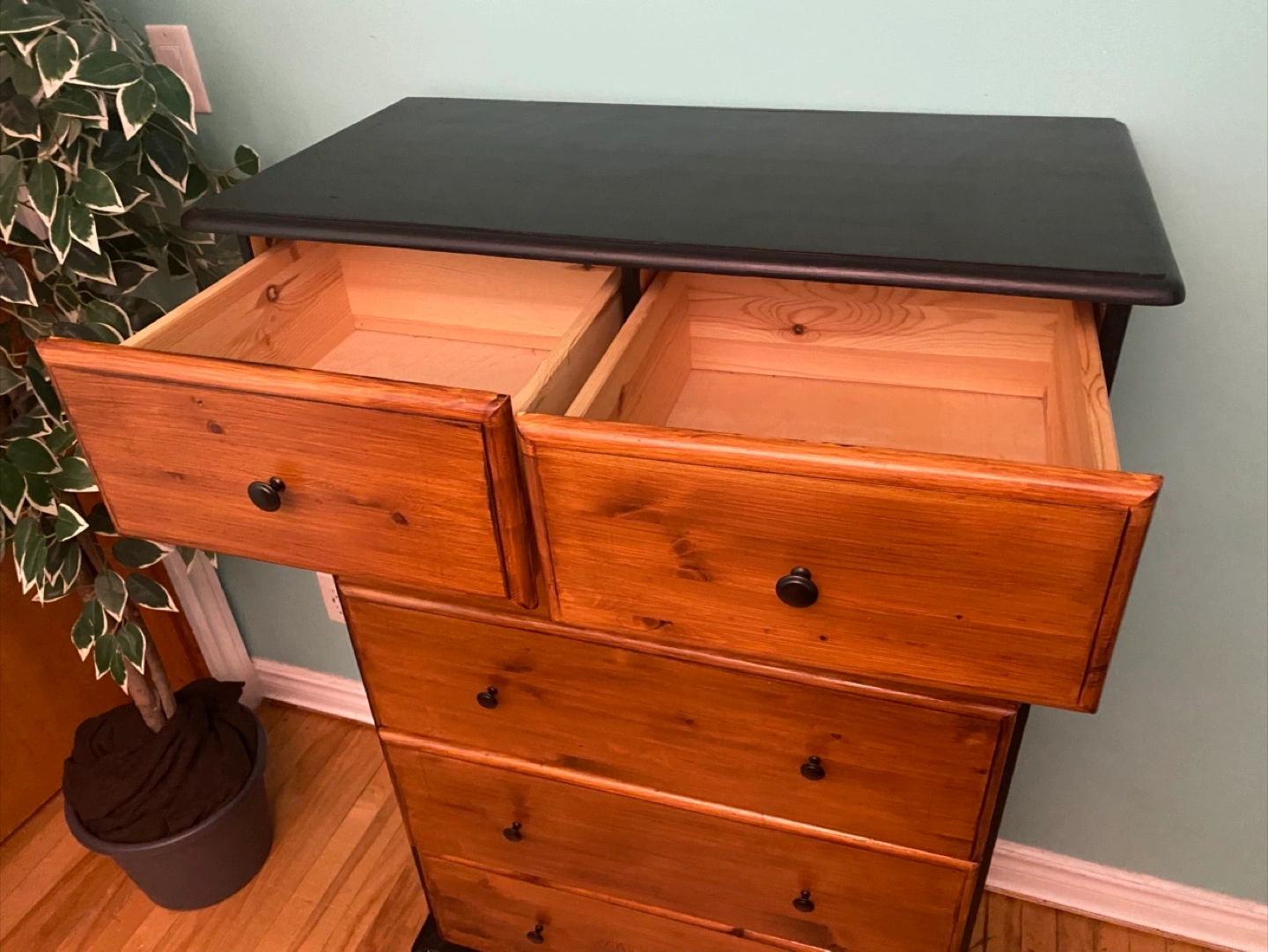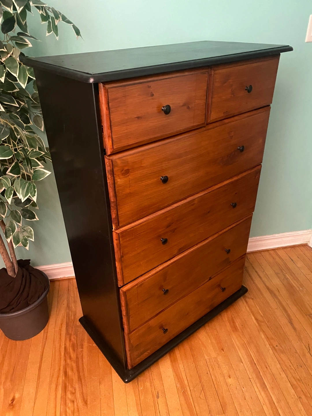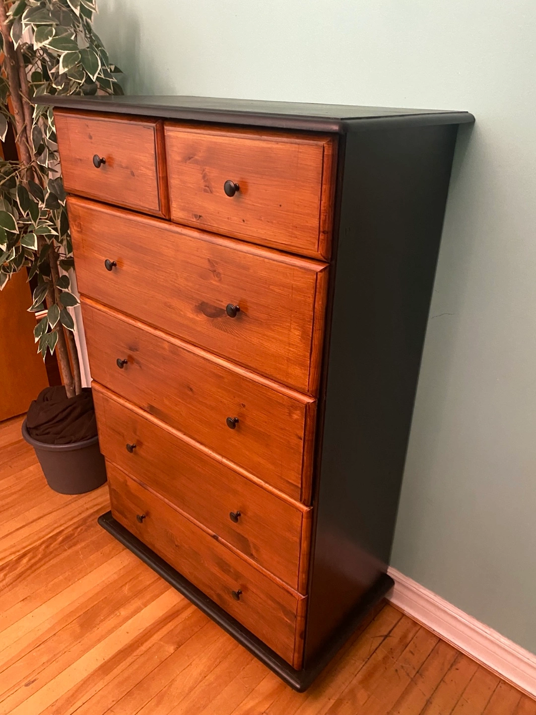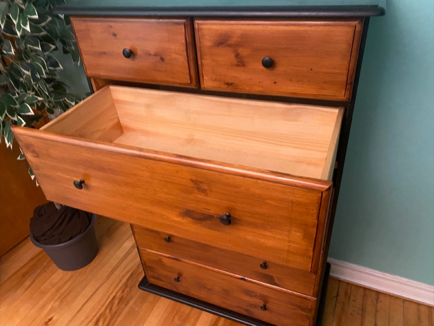 Tall and spacious dresser in excellent shape. Modern styling. Looks like new. Made from real pine wood. The exterior is completely refinished. Drawers open and close smoothly. Smoke-free / pet-free household with no odours. Delivery is included in the price, available throughout HRM. $200 Exact Measurements: Height: 52.75 inches (or 4 FT & 4.75 inches). Width: 33.75 inches (or 2 FT & 9.75 inches). Depth: 17.125 inches (or 1 FT & 5.125 inches). Fine print: Delivery Only. Free delivery within HRM only. Item is released from secure storage. Right to refuse on delivery.
