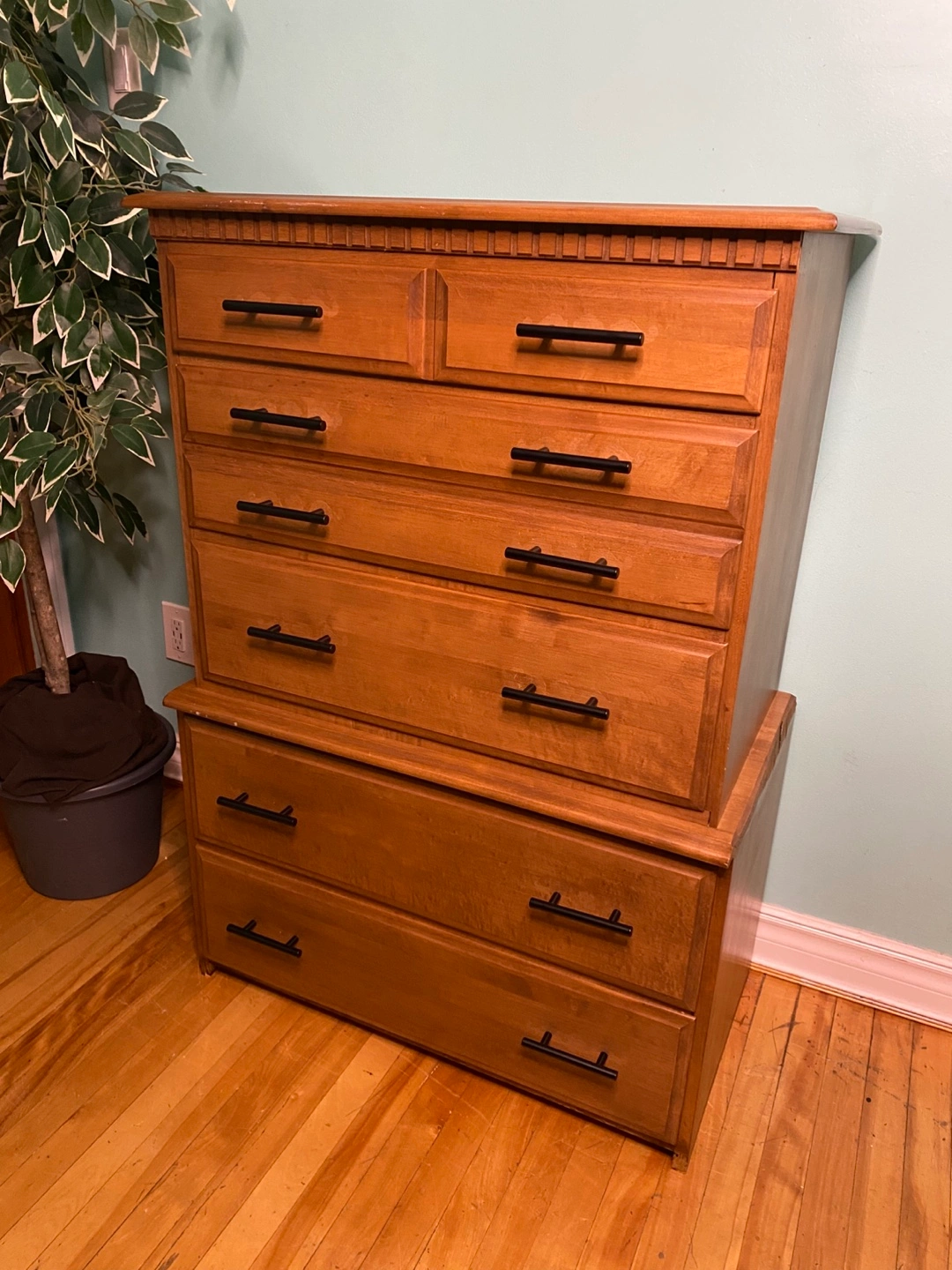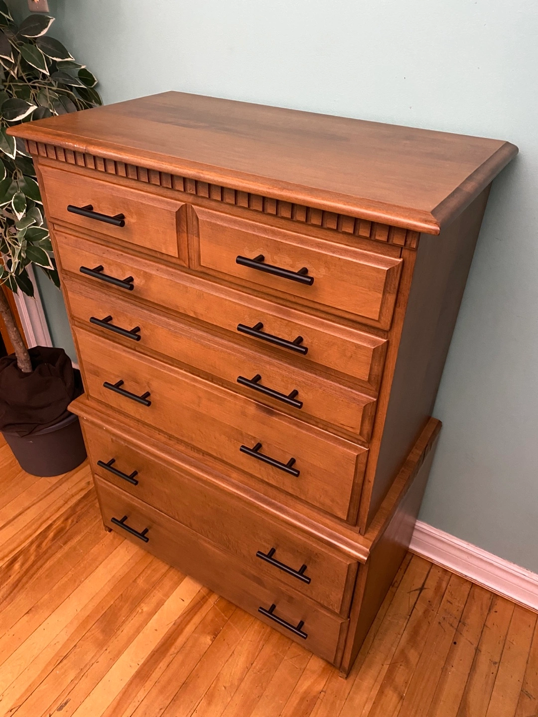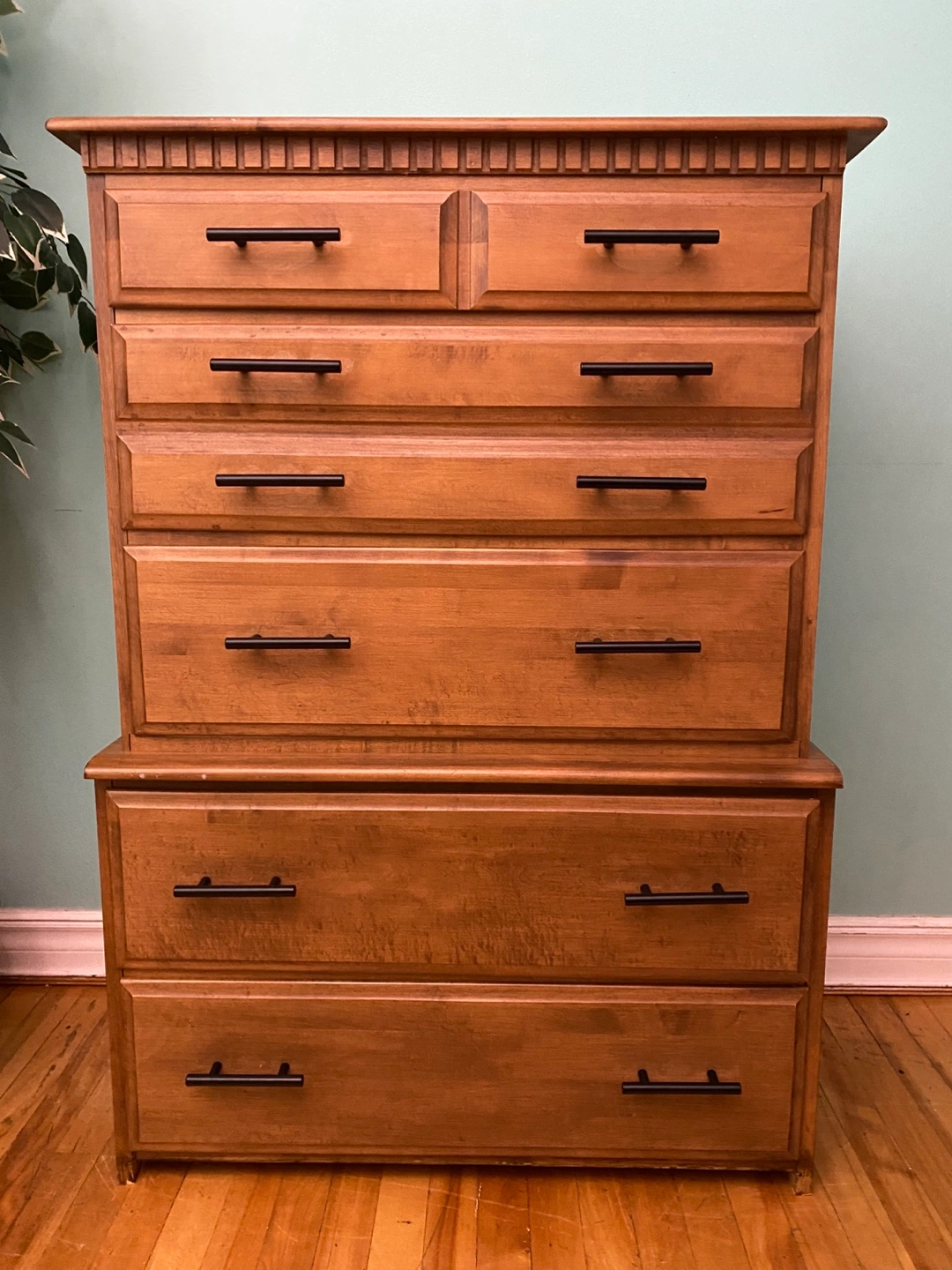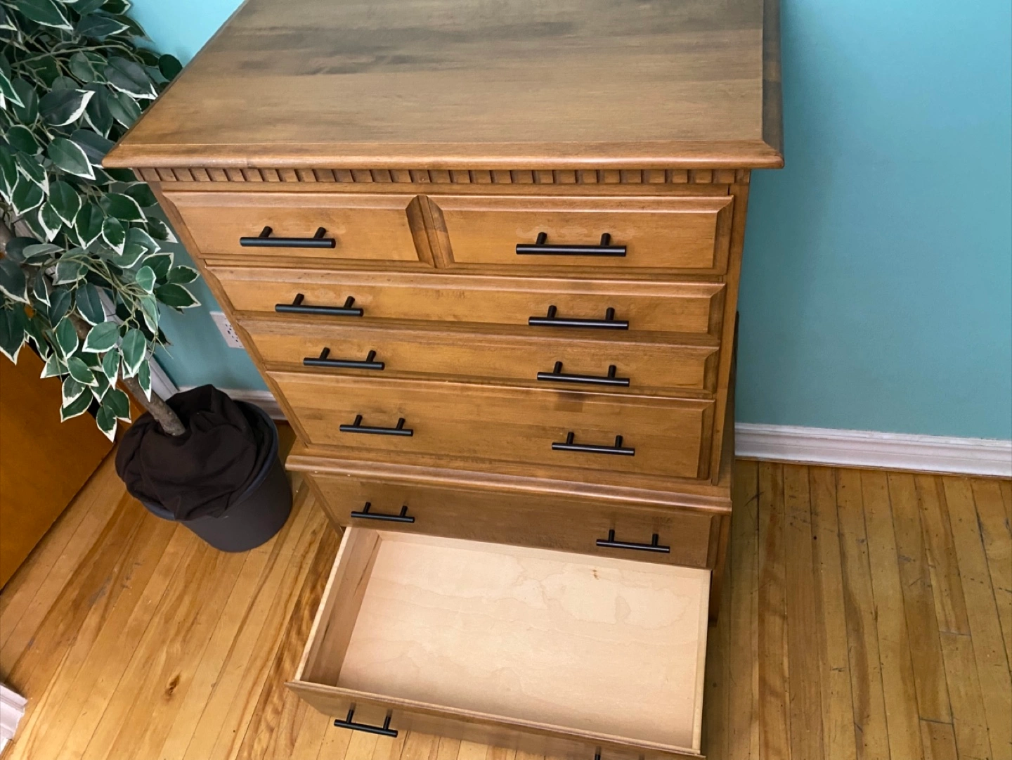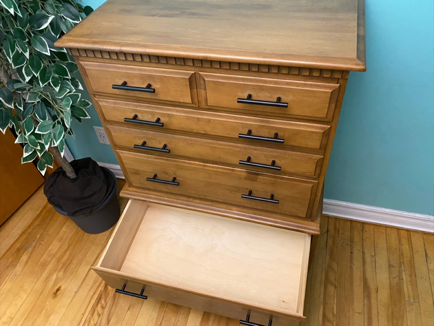 Tall maple dresser in great shape. Real maple wood and very sturdy construction. Drawers are expertly joined with dovetail joints. Modern styling, with new handles. Satin finish for a balance of aesthetic and durability from scuffs & liquids. All the drawers are clean and everything works perfectly. Smoke-free / pet-free household with no odours. Delivery is included in the price, available throughout HRM. Right to refuse on delivery, please check out and try out the dresser on delivery. $200 Exact Measurements: Height: 45.5 inches (or 3 FT & 9.5 inches). Width: 31.55 inches (or 2 FT & 7.55 inches). Depth: 17.25 inches (or 1 FT & 5.25 inches).