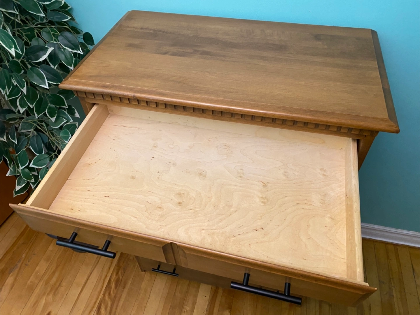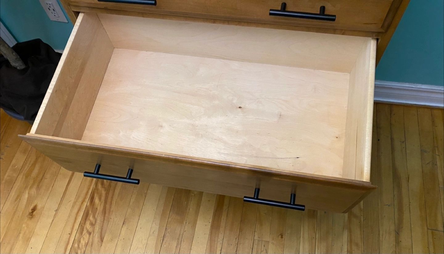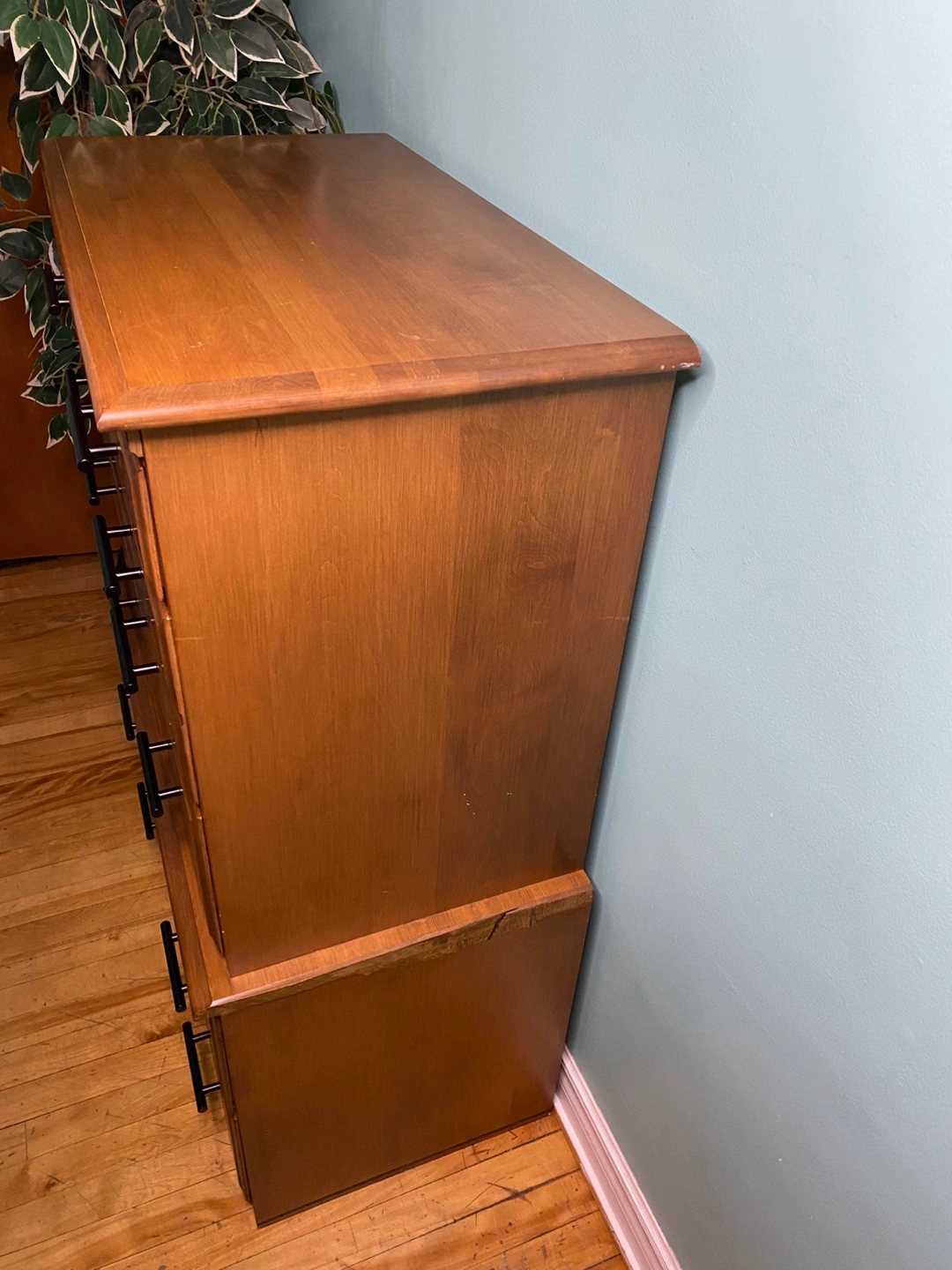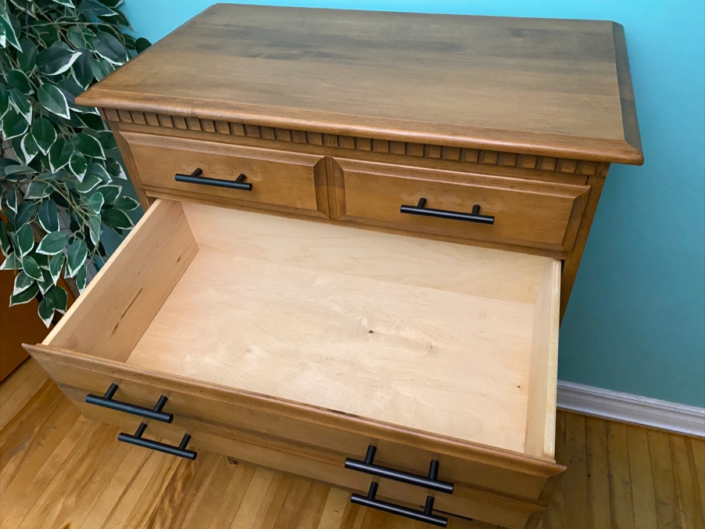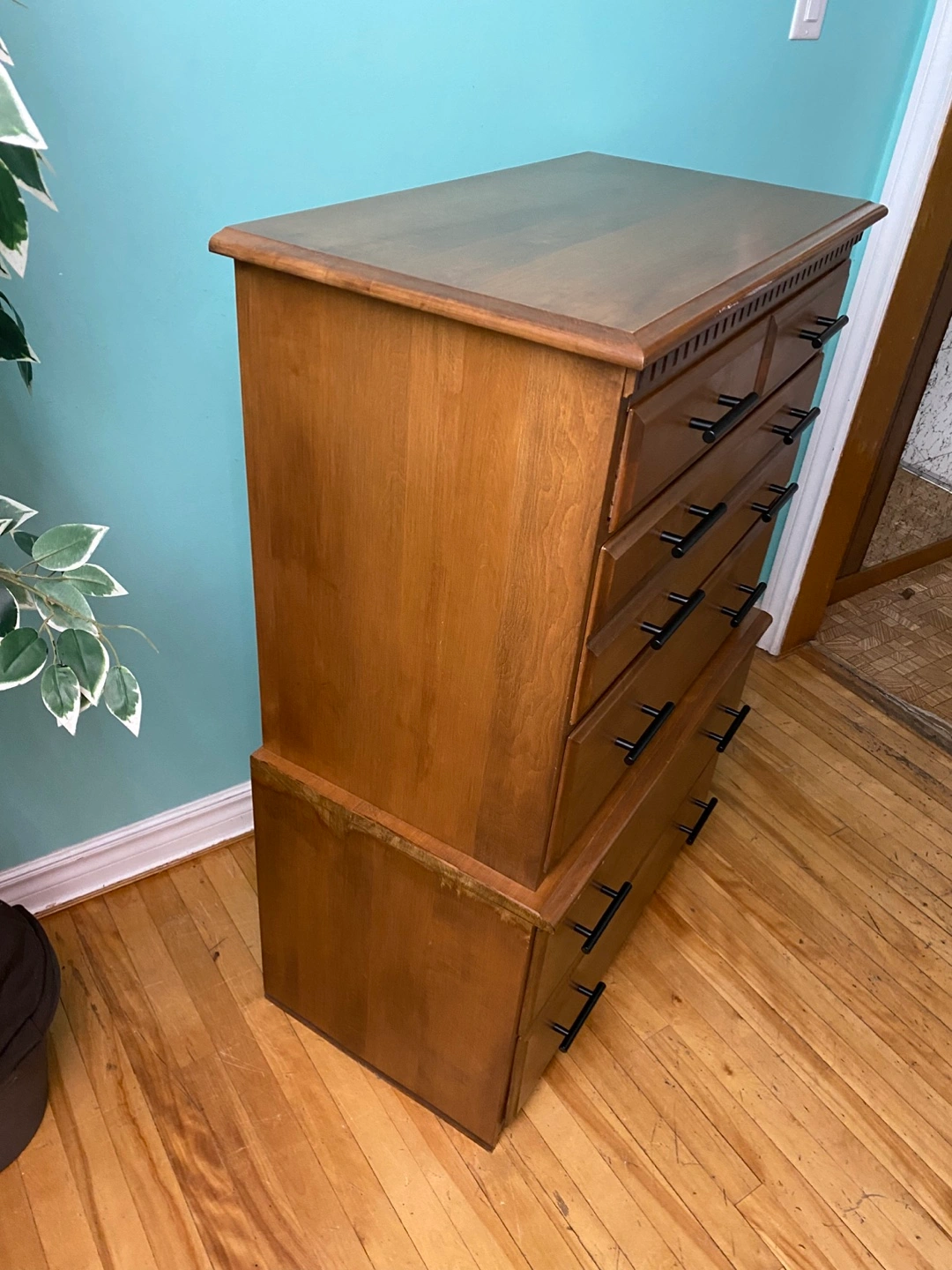 Tall maple dresser in great shape. Real maple wood and very sturdy construction. Drawers are expertly joined with dovetail joints. Modern styling, with new handles. Satin finish for a balance of aesthetic and durability from scuffs & liquids. All the drawers are clean and everything works perfectly. Smoke-free / pet-free household with no odours. Delivery is included in the price, available throughout HRM. Right to refuse on delivery, please check out and try out the dresser on delivery. $200 Exact Measurements: Height: 45.5 inches (or 3 FT & 9.5 inches). Width: 31.55 inches (or 2 FT & 7.55 inches). Depth: 17.25 inches (or 1 FT & 5.25 inches).