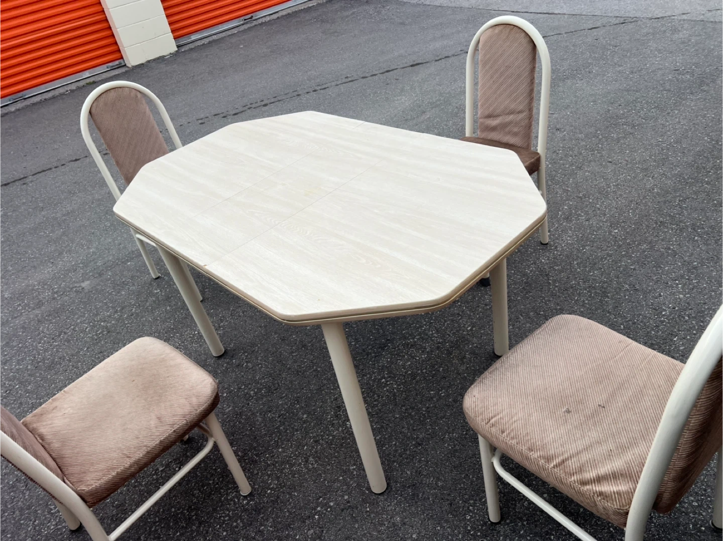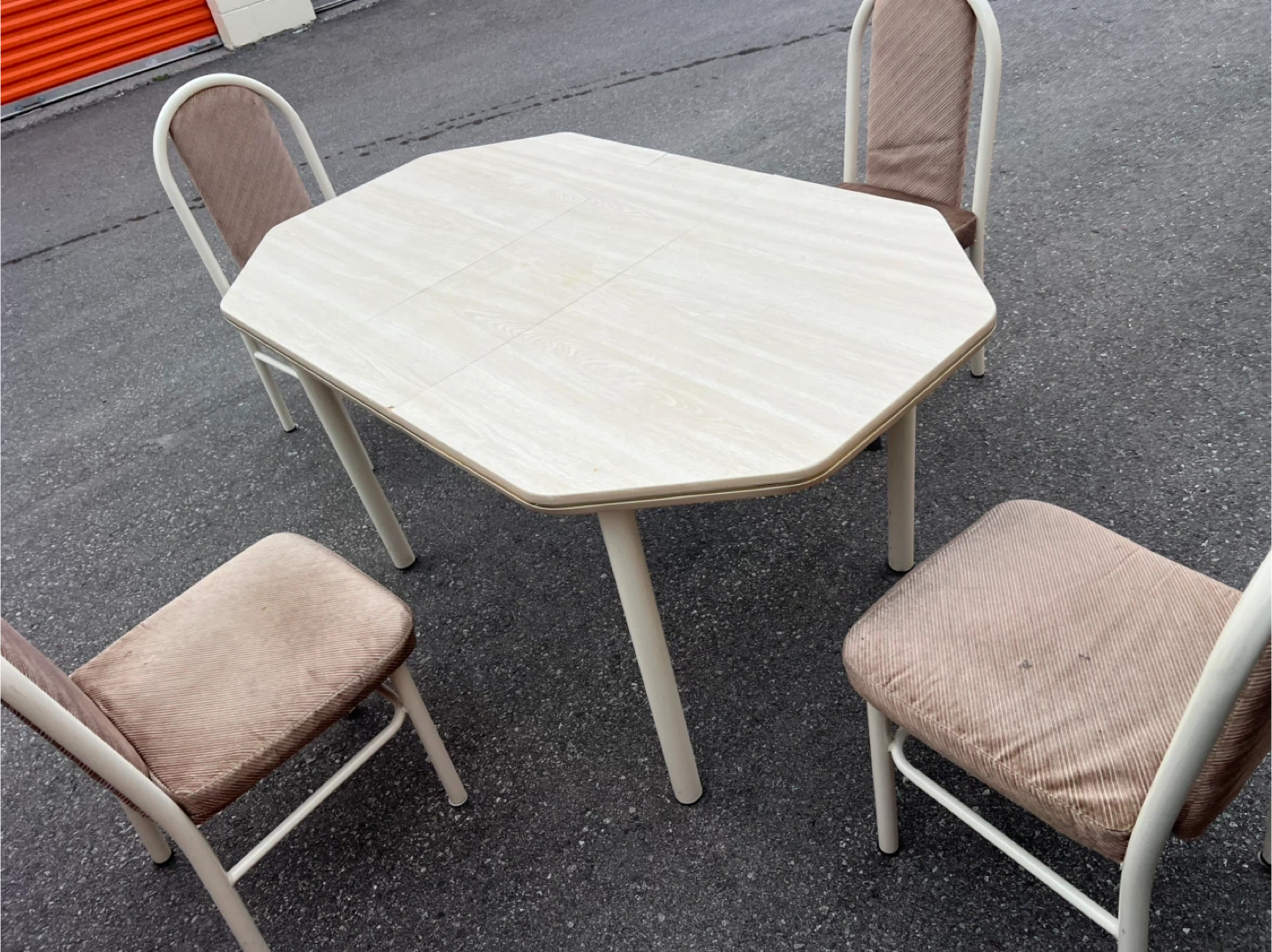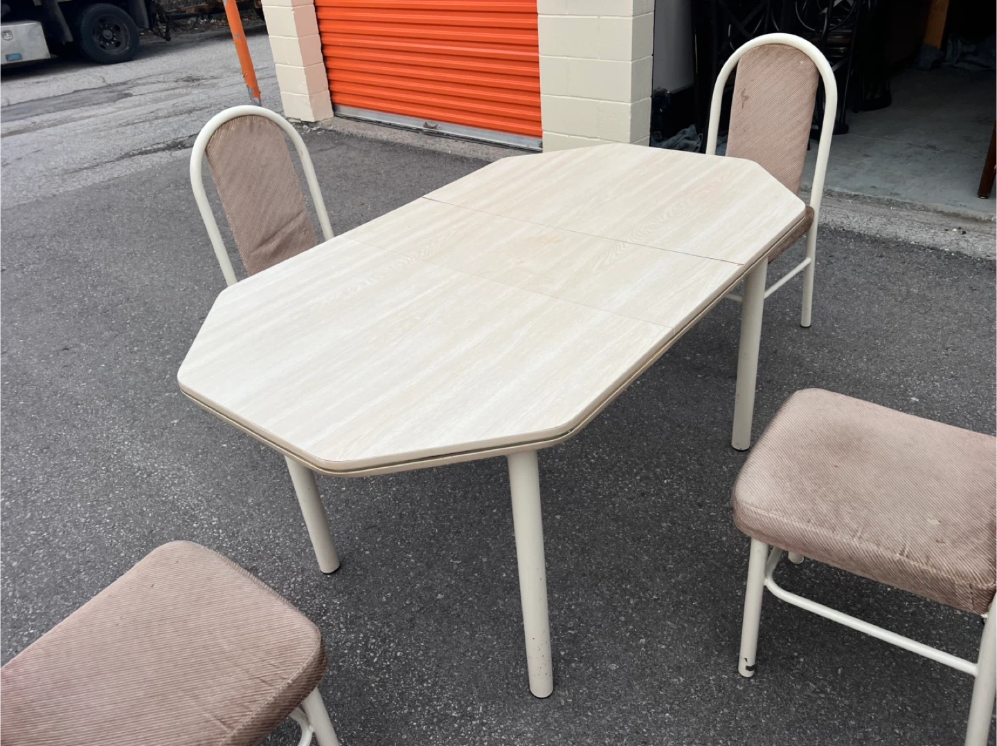 56680$ 5 feet by 3 feet 3.31 feet Extension (1 feet) Selling a used dining table with four matching chairs. The table has a unique octagonal shape and a toned surface. The chairs have a comfortable fabric seat and backrest. Perfect for a small dining area or kitchen nook! Delivery Pricing: * Scarborough: (Free) * Downtown Toronto, North York, East York, Markham, Pickering, Ajax, Richmond Hill (Delivery Fee: $20) * Vaughan, Etobicoke, Stouffville, Mississauga , Brampton (Delivery Fee: $30) *Oshawa,Aurora ,Newmarket , Whitby (Delivery Fee: $40) * King City (Delivery Fee: $50) Note: We may deliver some items outside the listed areas. Please understand that delivery in these cases could cost more than the furniture. - Night shift delivery available to accommodate those who work during the day Explore our collection of new and used furniture on our Facebook page. Follow us: *For all furniture: Facebook : https://www.facebook.com/kfurnitures?mibextid=kFxxJD Instagram : https://www.instagram.com/karout_furniture?igsh=NmxkZGlnNjRsNGdi&utm_source=qr *For clearance furnitures : https://www.facebook.com/profile.php?id=61559717161604&mibextid=LQQJ4d Purchase new furniture online: https://karoutmoving.ca/shop/ Cell: 647-391-8784 All furniture is delivered by Karout Moving & Delivery. *For moving & delivery services: www.karoutmoving.ca Cell: 647-740-8205 *Note: All items are as shown in the pictures and videos. *Note: Deliveries are made to the front of your building or house. *Note: No holds for furniture , we operate on a day-by-day basis.