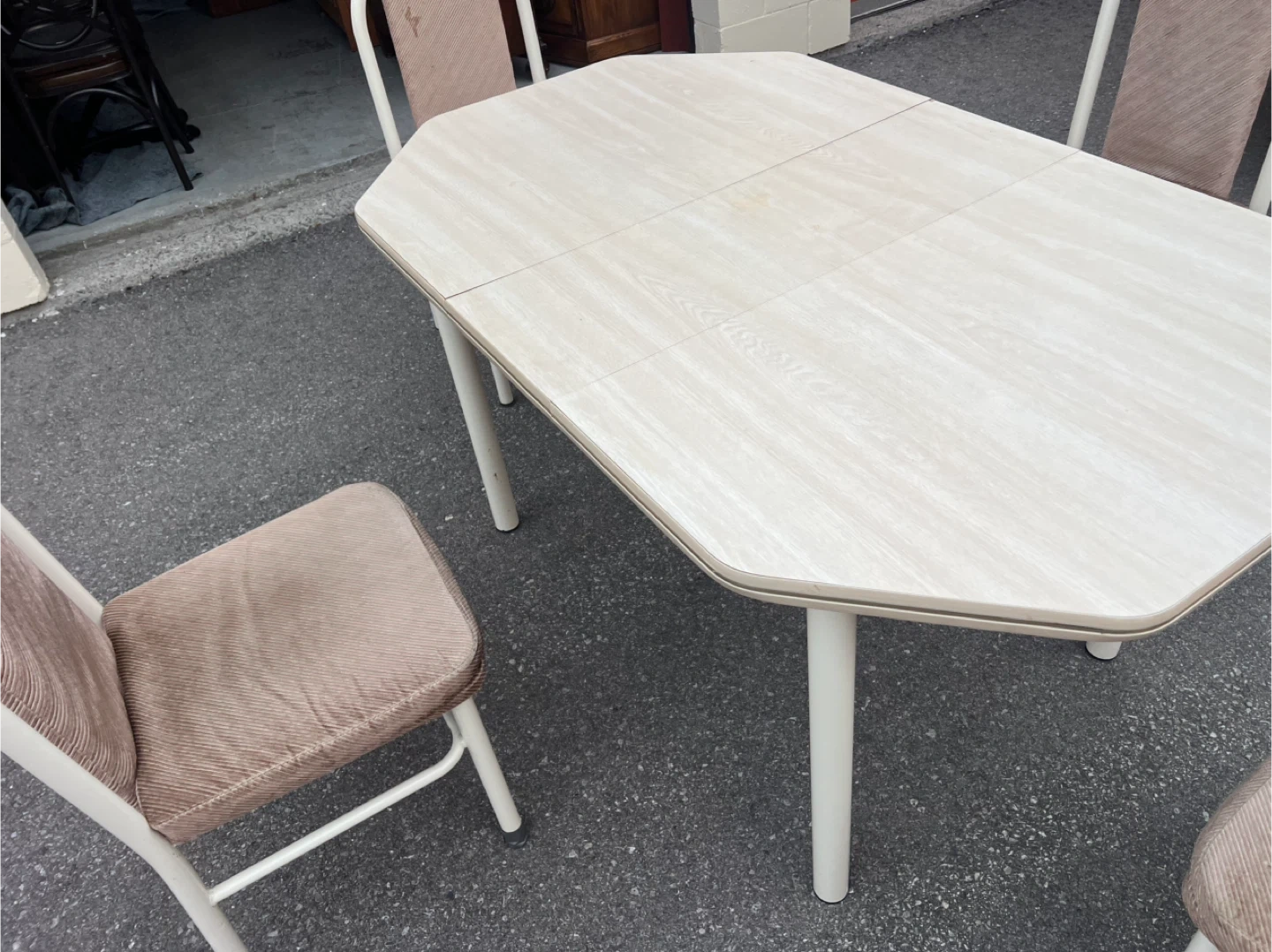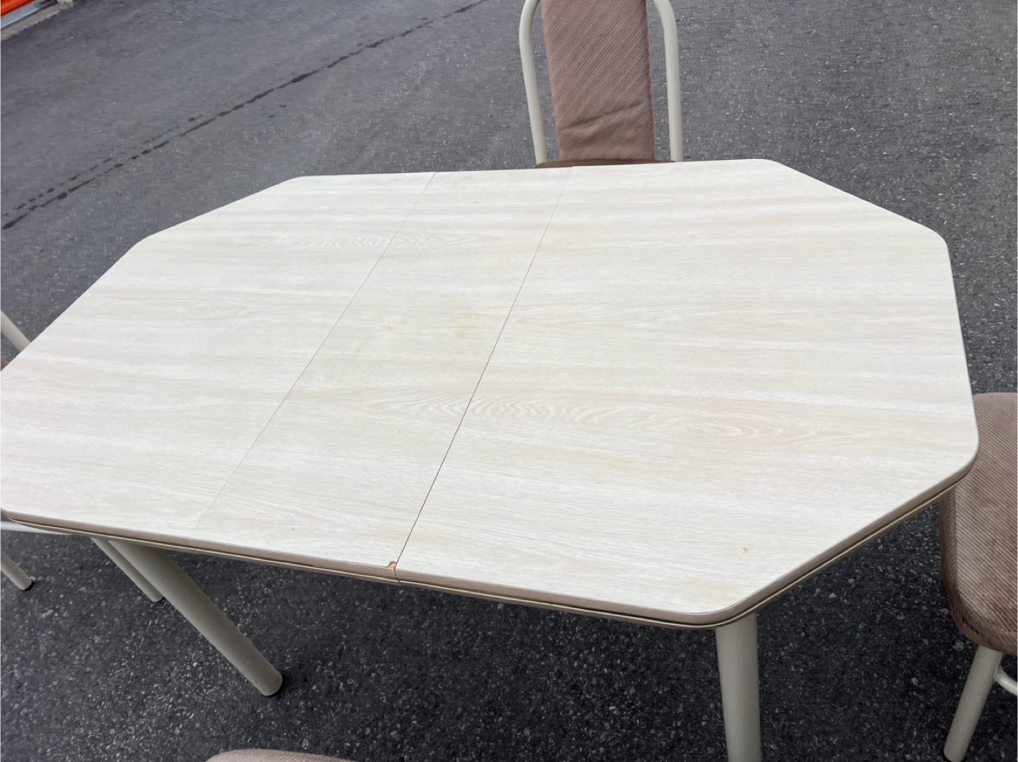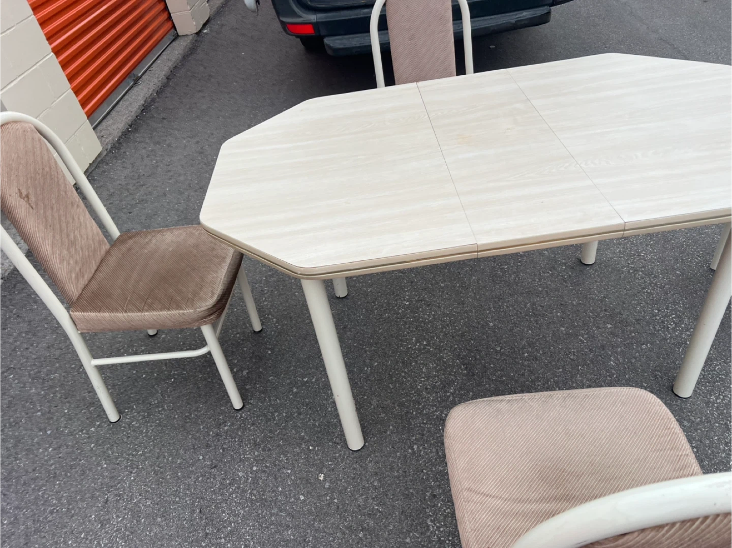 56680$ 5 feet by 3 feet 3.31 feet Extension (1 feet) Selling a used dining table with four matching chairs. The table has a unique octagonal shape and a toned surface. The chairs have a comfortable fabric seat and backrest. Perfect for a small dining area or kitchen nook! Delivery Pricing: * Scarborough: (Free) * Downtown Toronto, North York, East York, Markham, Pickering, Ajax, Richmond Hill (Delivery Fee: $20) * Vaughan, Etobicoke, Stouffville, Mississauga , Brampton (Delivery Fee: $30) *Oshawa,Aurora ,Newmarket , Whitby (Delivery Fee: $40) * King City (Delivery Fee: $50) Note: We may deliver some items outside the listed areas. Please understand that delivery in these cases could cost more than the furniture. - Night shift delivery available to accommodate those who work during the day Explore our collection of new and used furniture on our Facebook page. Follow us: *For all furniture: Facebook : https://www.facebook.com/kfurnitures?mibextid=kFxxJD Instagram : https://www.instagram.com/karout_furniture?igsh=NmxkZGlnNjRsNGdi&utm_source=qr *For clearance furnitures : https://www.facebook.com/profile.php?id=61559717161604&mibextid=LQQJ4d Purchase new furniture online: https://karoutmoving.ca/shop/ Cell: 647-391-8784 All furniture is delivered by Karout Moving & Delivery. *For moving & delivery services: www.karoutmoving.ca Cell: 647-740-8205 *Note: All items are as shown in the pictures and videos. *Note: Deliveries are made to the front of your building or house. *Note: No holds for furniture , we operate on a day-by-day basis.
