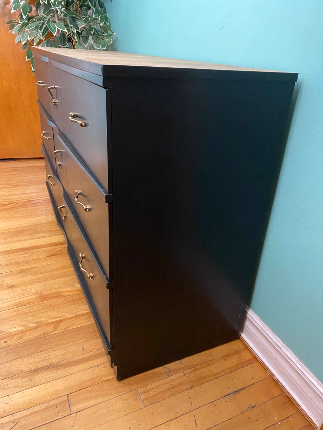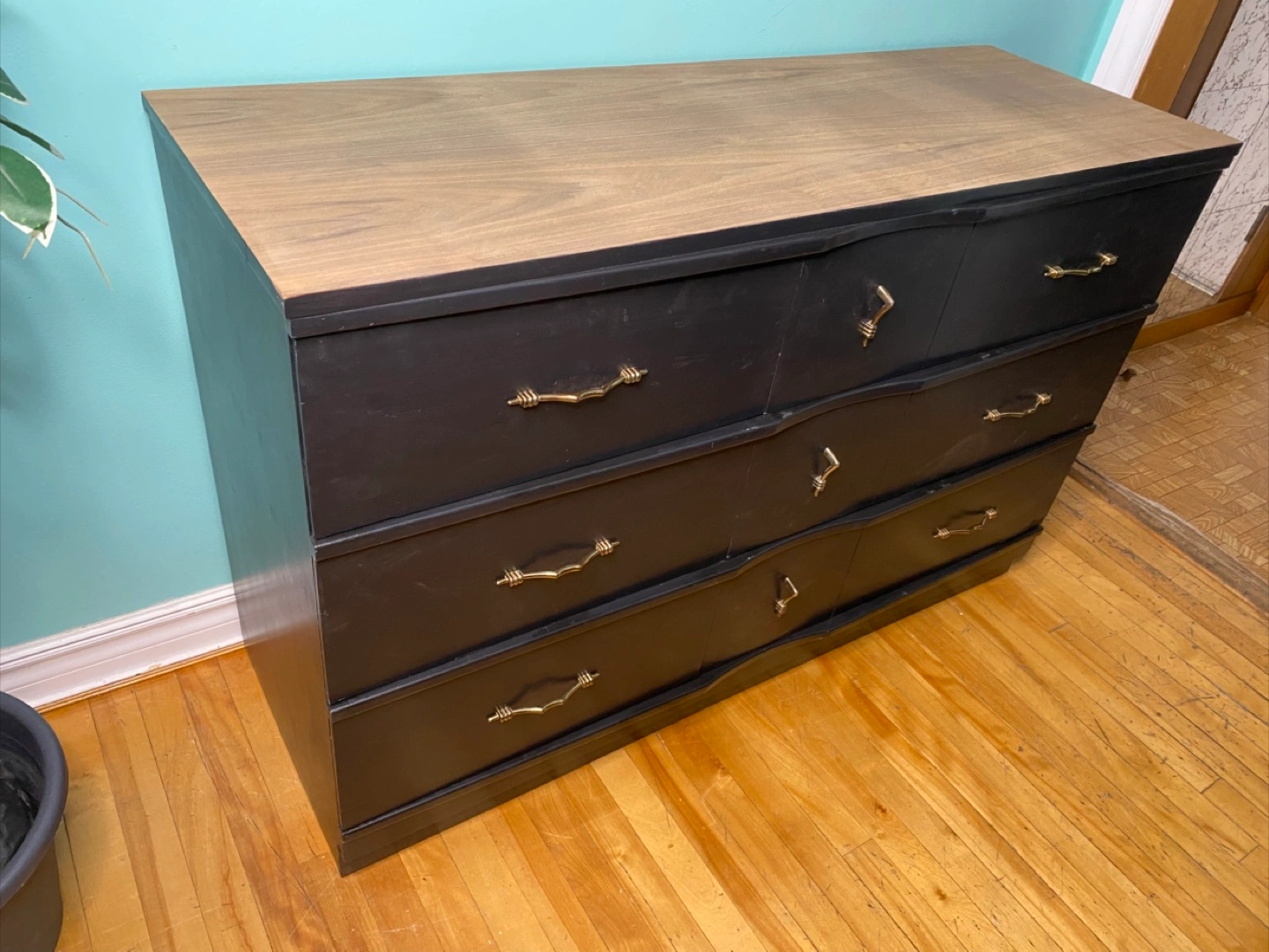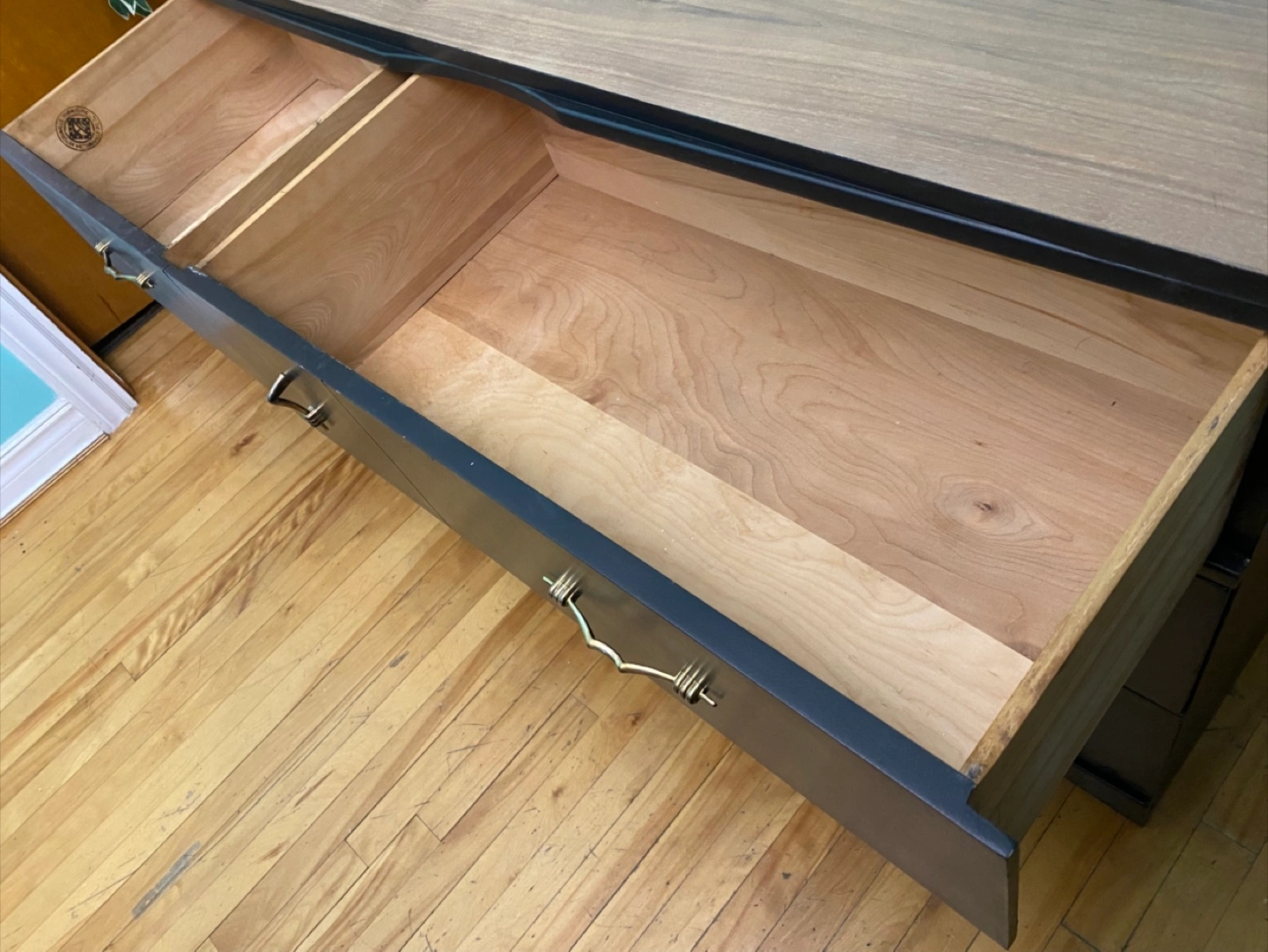 81Exquisite Victoriaville dresser. The top is made from real Walnut wood. Drawer framing is made from real Maple. Those familiar with this brand know the workmanship, sturdiness and quality materials you can expect, which is reflected in the price. Yes, drawers have dovetail joints. Mid-century modern styling with a twist of Hollywood Regency flair in the design. The top looks like new as it has been redone. All the drawers slide easily. The drawer tracks have extra silicone oil applied for a long life ahead. Large drawers to do what you need, whenever you’re not spending time admiring the look. Smoke-free / pet-free household. No odours. Delivery is included in the price, available throughout HRM. $160 Exact Measurements: Height: 32.3 inches (or 2 FT & 8.3 inches). Width: 50.125 inches (or 4 FT & 2.125 inches). Depth: 18.25 inches (or 1 FT & 6.25 inches). Delivery Only. Free delivery within HRM only. Item is released from secure storage. Right to refuse on delivery. This item includes delivery/handling by 2 people to carefully place it where you ask.