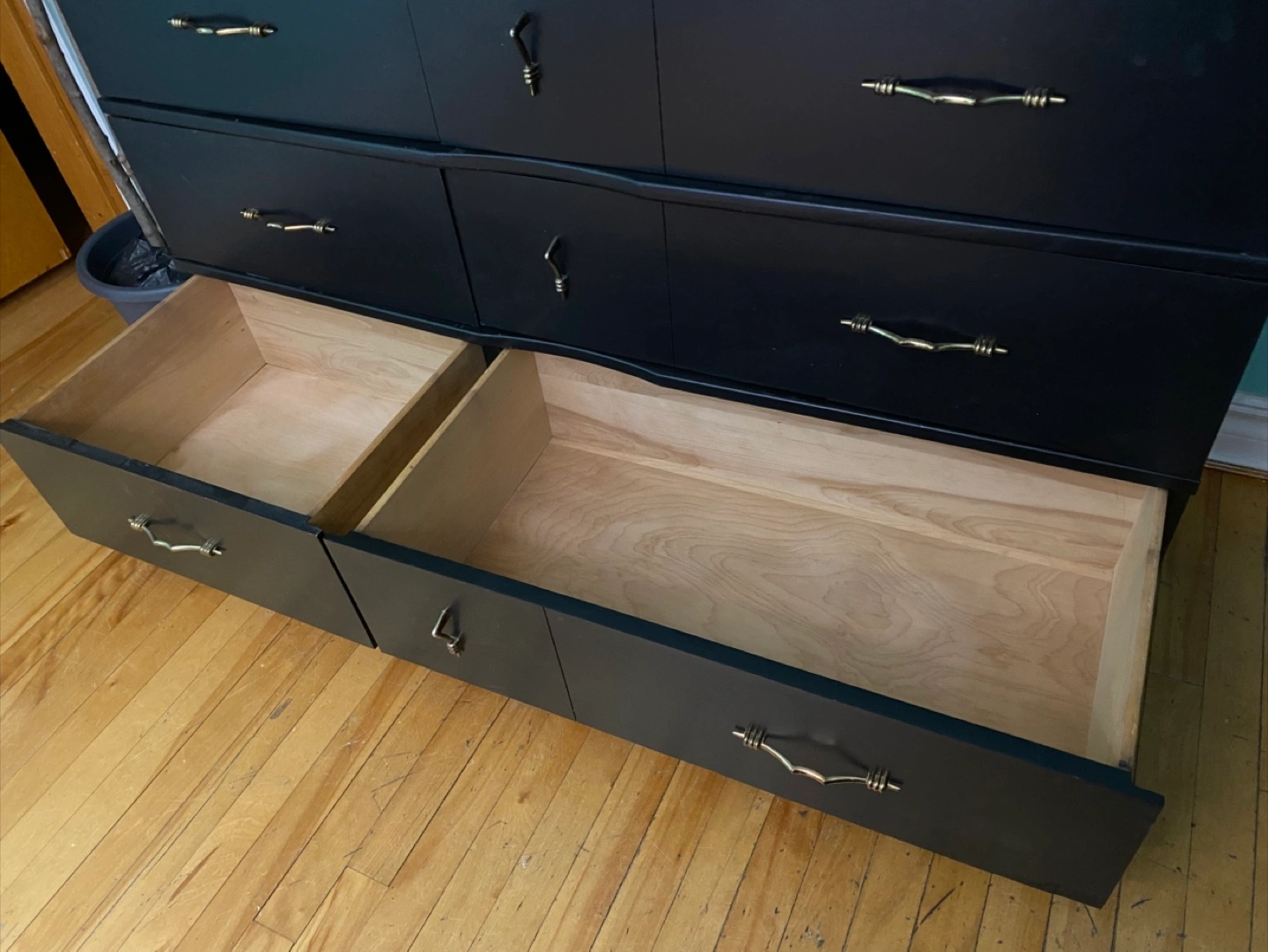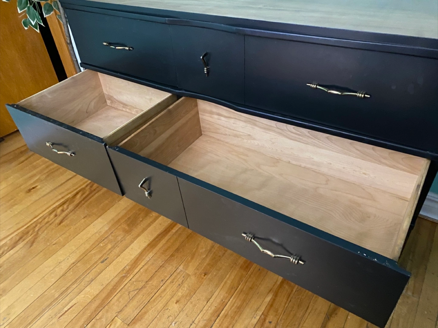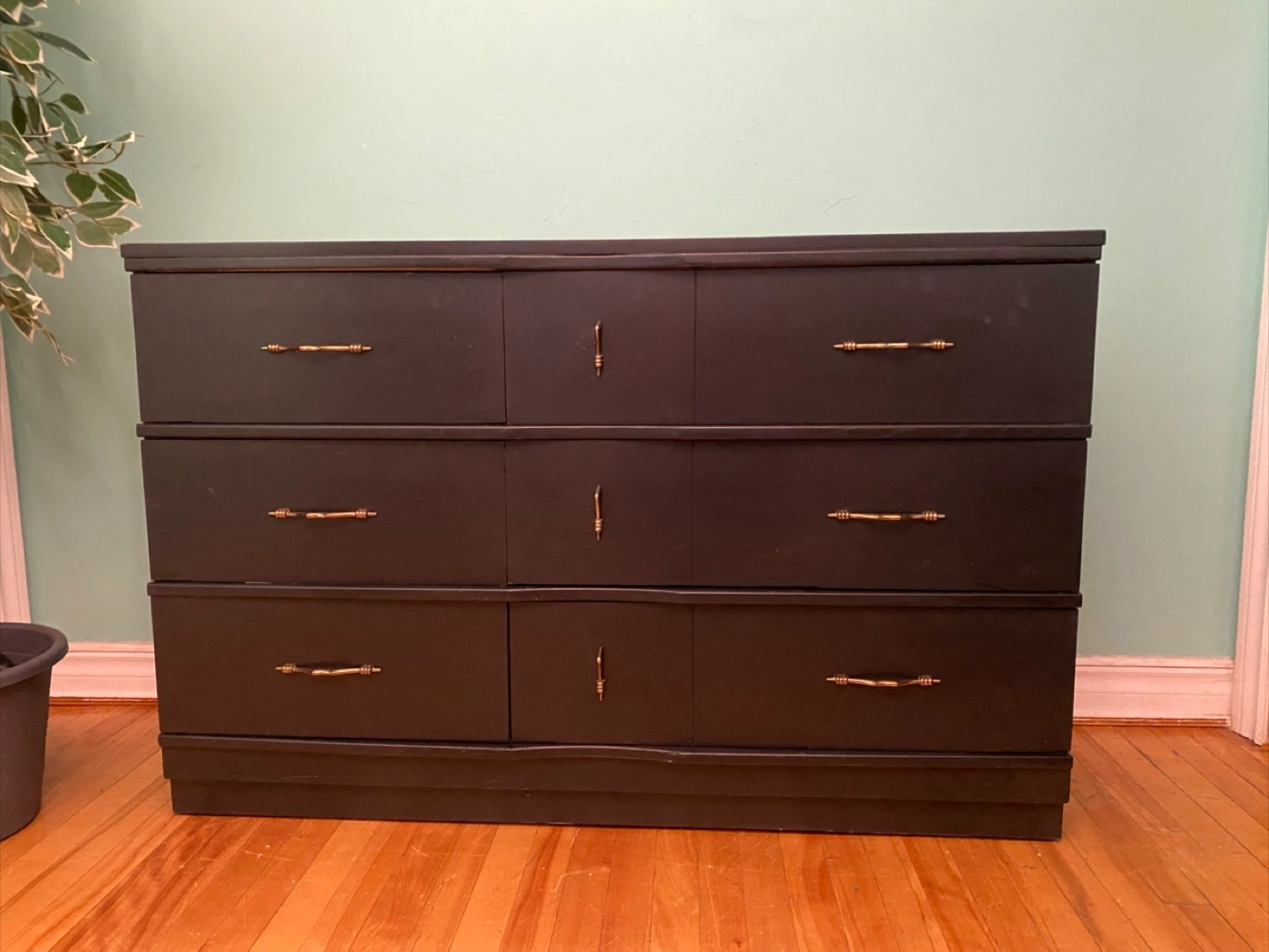 81Exquisite Victoriaville dresser. The top is made from real Walnut wood. Drawer framing is made from real Maple. Those familiar with this brand know the workmanship, sturdiness and quality materials you can expect, which is reflected in the price. Yes, drawers have dovetail joints. Mid-century modern styling with a twist of Hollywood Regency flair in the design. The top looks like new as it has been redone. All the drawers slide easily. The drawer tracks have extra silicone oil applied for a long life ahead. Large drawers to do what you need, whenever you’re not spending time admiring the look. Smoke-free / pet-free household. No odours. Delivery is included in the price, available throughout HRM. $160 Exact Measurements: Height: 32.3 inches (or 2 FT & 8.3 inches). Width: 50.125 inches (or 4 FT & 2.125 inches). Depth: 18.25 inches (or 1 FT & 6.25 inches). Delivery Only. Free delivery within HRM only. Item is released from secure storage. Right to refuse on delivery. This item includes delivery/handling by 2 people to carefully place it where you ask.