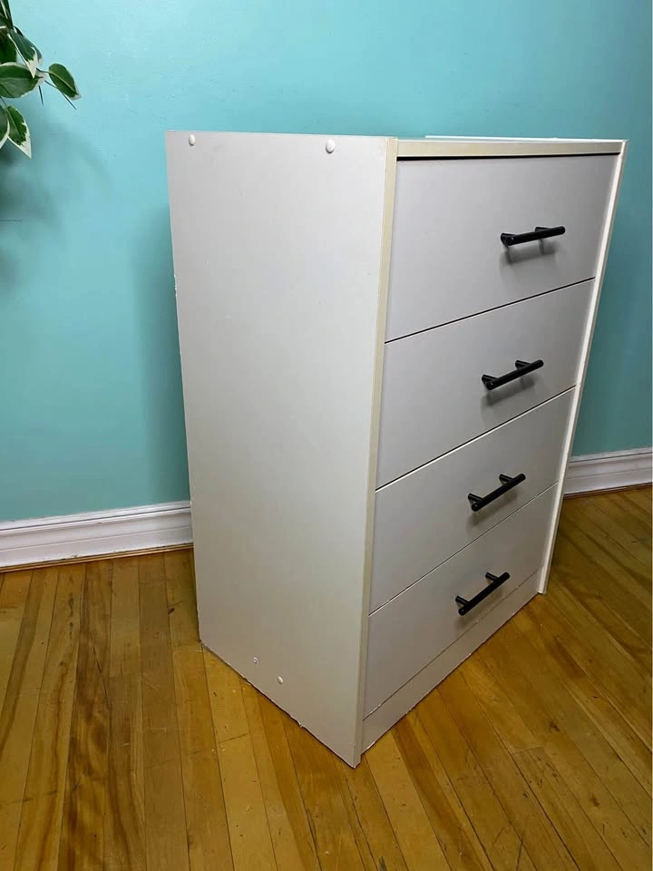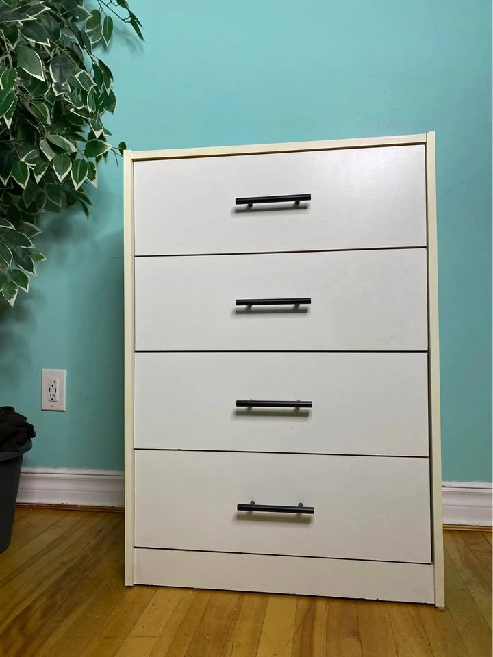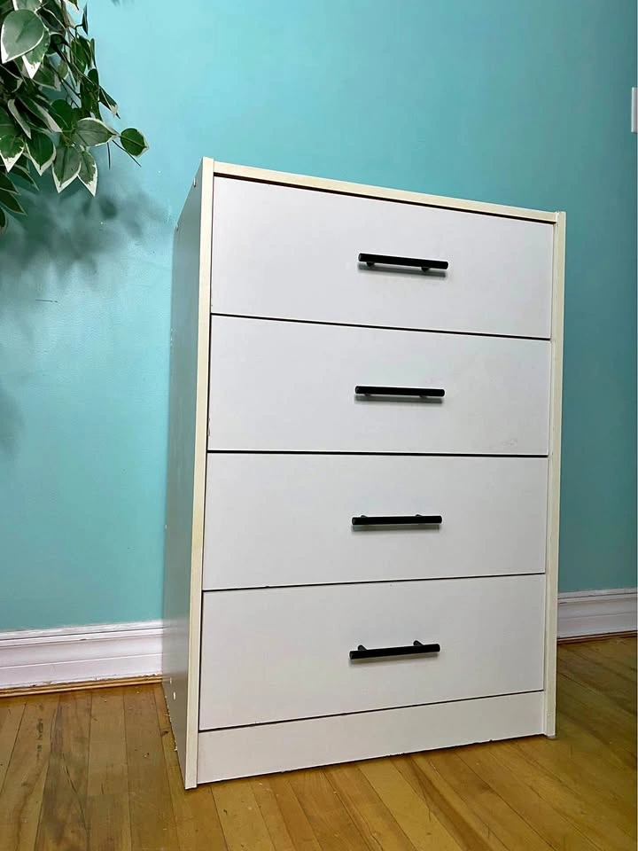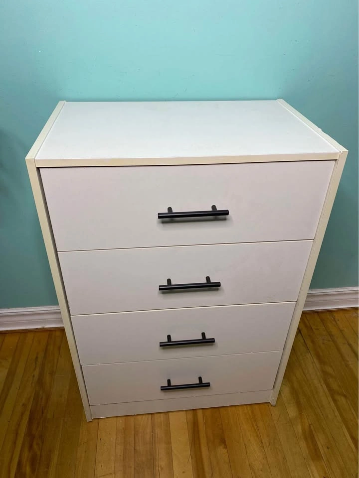 White 4-drawer dresser in good condition. Modern styling. Sturdy. All the drawers open and close smoothly without any issues. Fully functional. There is minor wear on some corners which has been painted in to blend, to make it not very noticeable. $100 Exact Measurements: Height: 36 inches (or 3 FT exactly). Width: 24.85 inches (or 2 FT & 0.85 inches). Depth: 16 inches (or 1 FT & 4 inches).