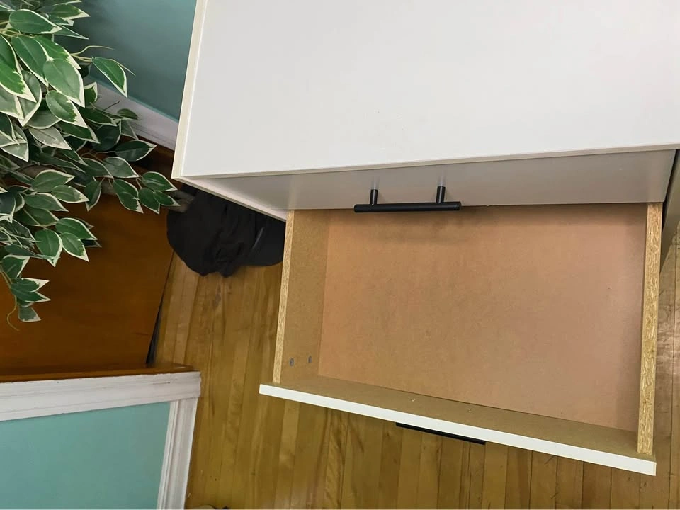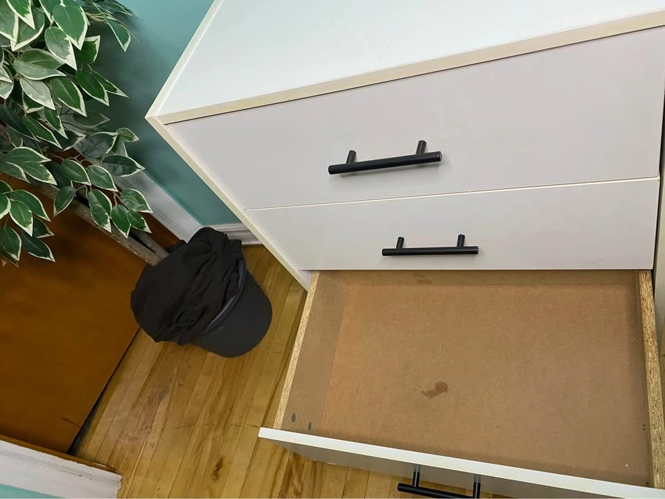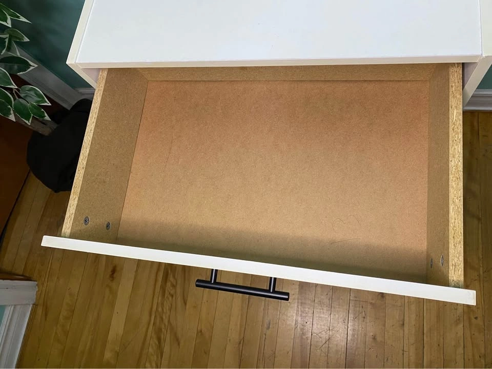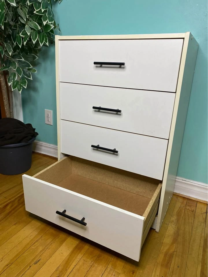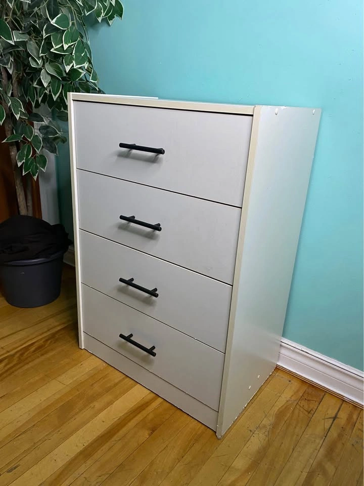 White 4-drawer dresser in good condition. Modern styling. Sturdy. All the drawers open and close smoothly without any issues. Fully functional. There is minor wear on some corners which has been painted in to blend, to make it not very noticeable. $100 Exact Measurements: Height: 36 inches (or 3 FT exactly). Width: 24.85 inches (or 2 FT & 0.85 inches). Depth: 16 inches (or 1 FT & 4 inches).