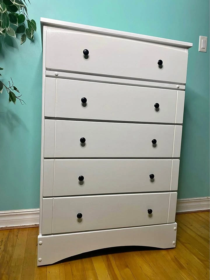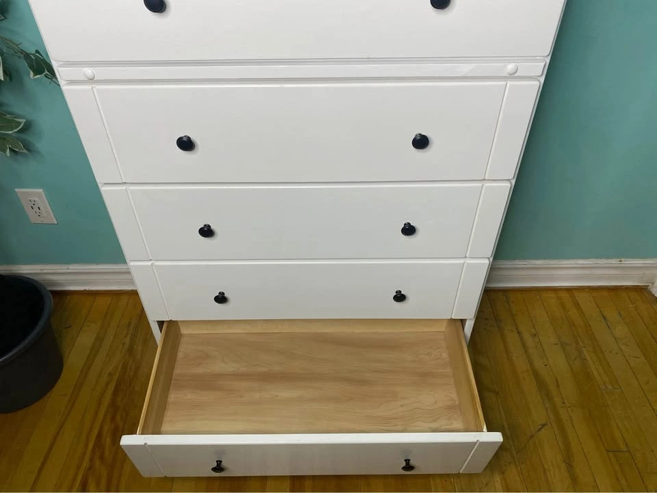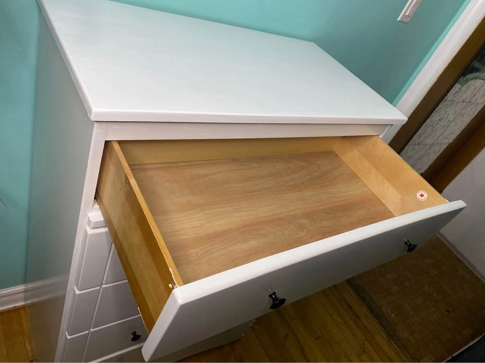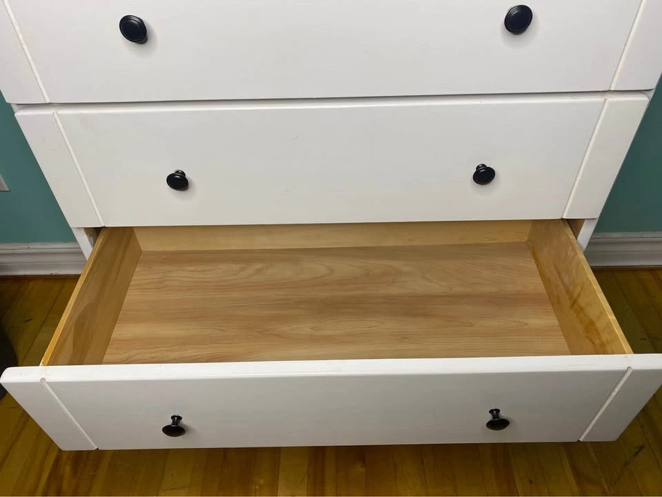 Tall real maple hardwood dresser. Modern styling. Super sturdy and assembled solidly with large pieces, easier to see in person that this is a high quality piece. Made in Canada. All the drawers move smoothly and drawers stop when fully retracted. No issues. Smoke-free / pet-free household with no discernible odours. Delivery is included in the price, available throughout HRM. Please check out & try out the dresser on delivery, there is a right to refuse policy in effect. $250 Exact Measurements: Height: 46.4 inches (or 3 FT & 10.4 inches). Width: 31.25 inches (or 2 FT & 7.25 inches). Depth: 16.5 inches (or 1 FT & 4.5 inches).