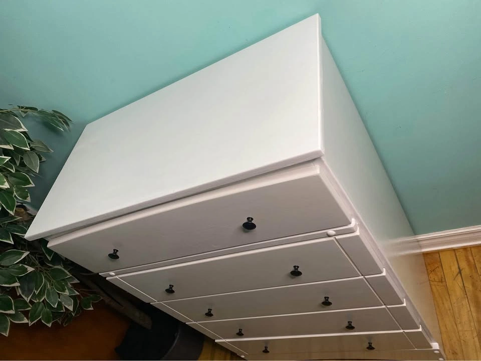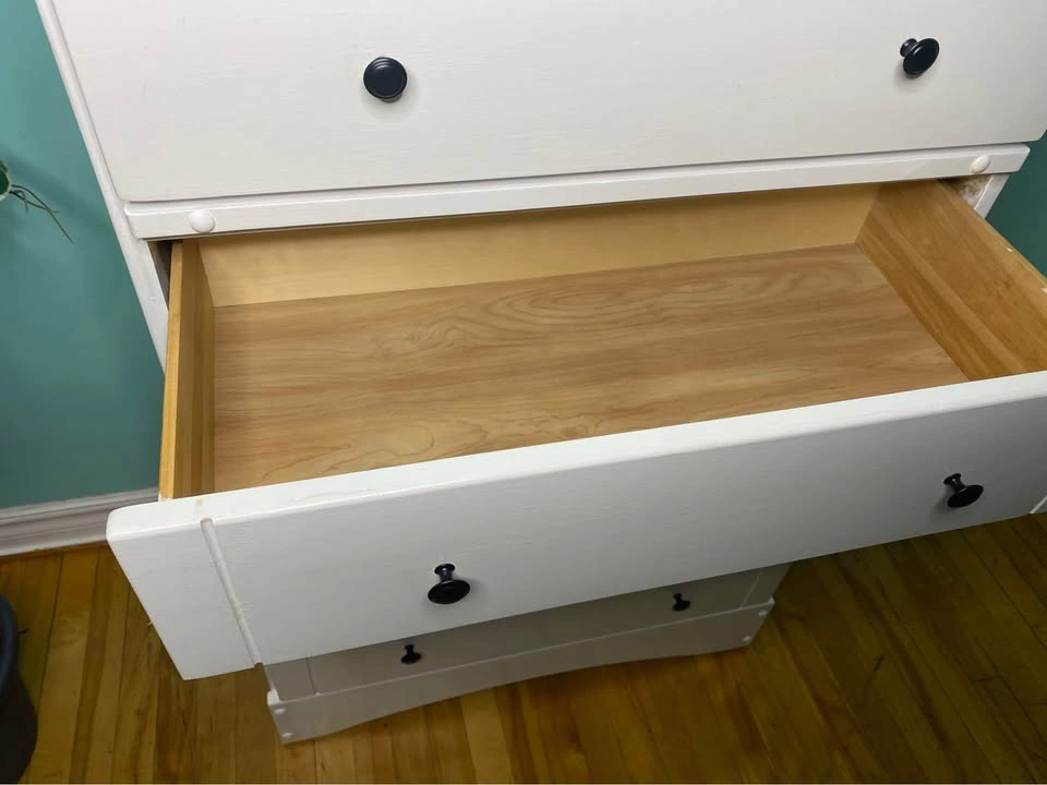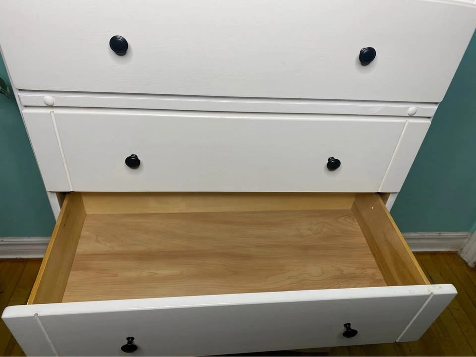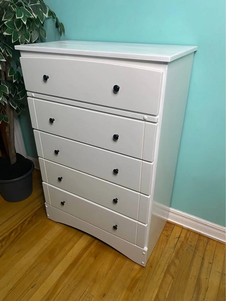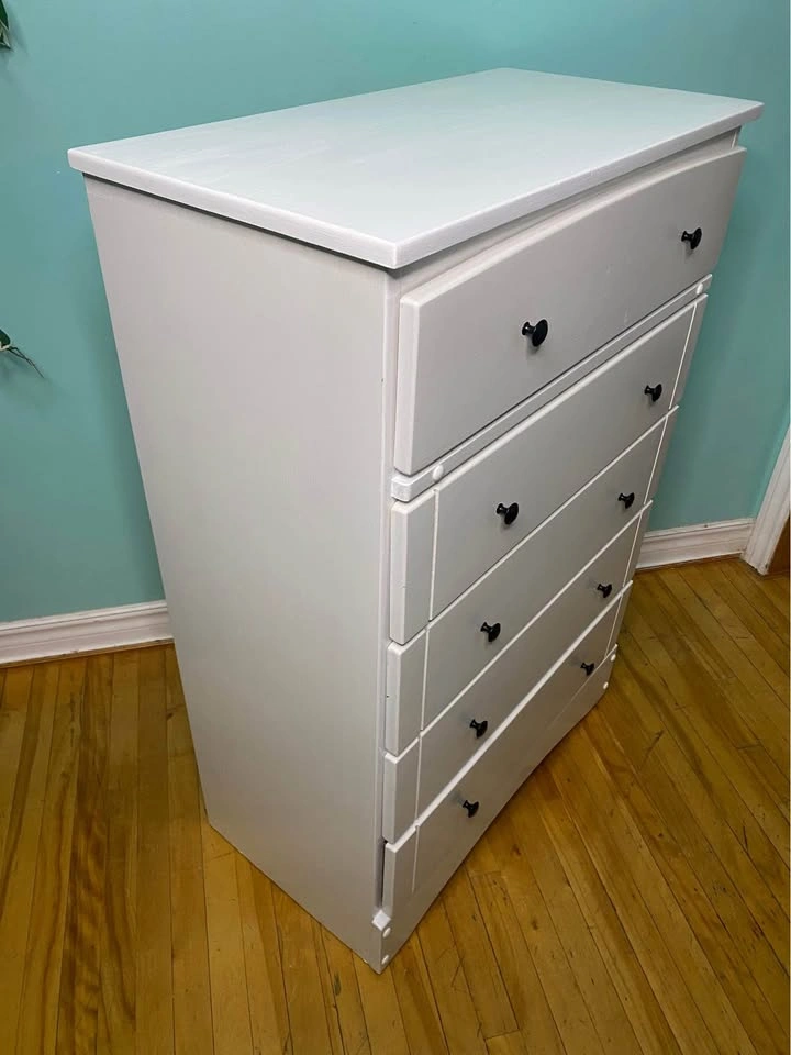 Tall real maple hardwood dresser. Modern styling. Super sturdy and assembled solidly with large pieces, easier to see in person that this is a high quality piece. Made in Canada. All the drawers move smoothly and drawers stop when fully retracted. No issues. Smoke-free / pet-free household with no discernible odours. Delivery is included in the price, available throughout HRM. Please check out & try out the dresser on delivery, there is a right to refuse policy in effect. $250 Exact Measurements: Height: 46.4 inches (or 3 FT & 10.4 inches). Width: 31.25 inches (or 2 FT & 7.25 inches). Depth: 16.5 inches (or 1 FT & 4.5 inches).