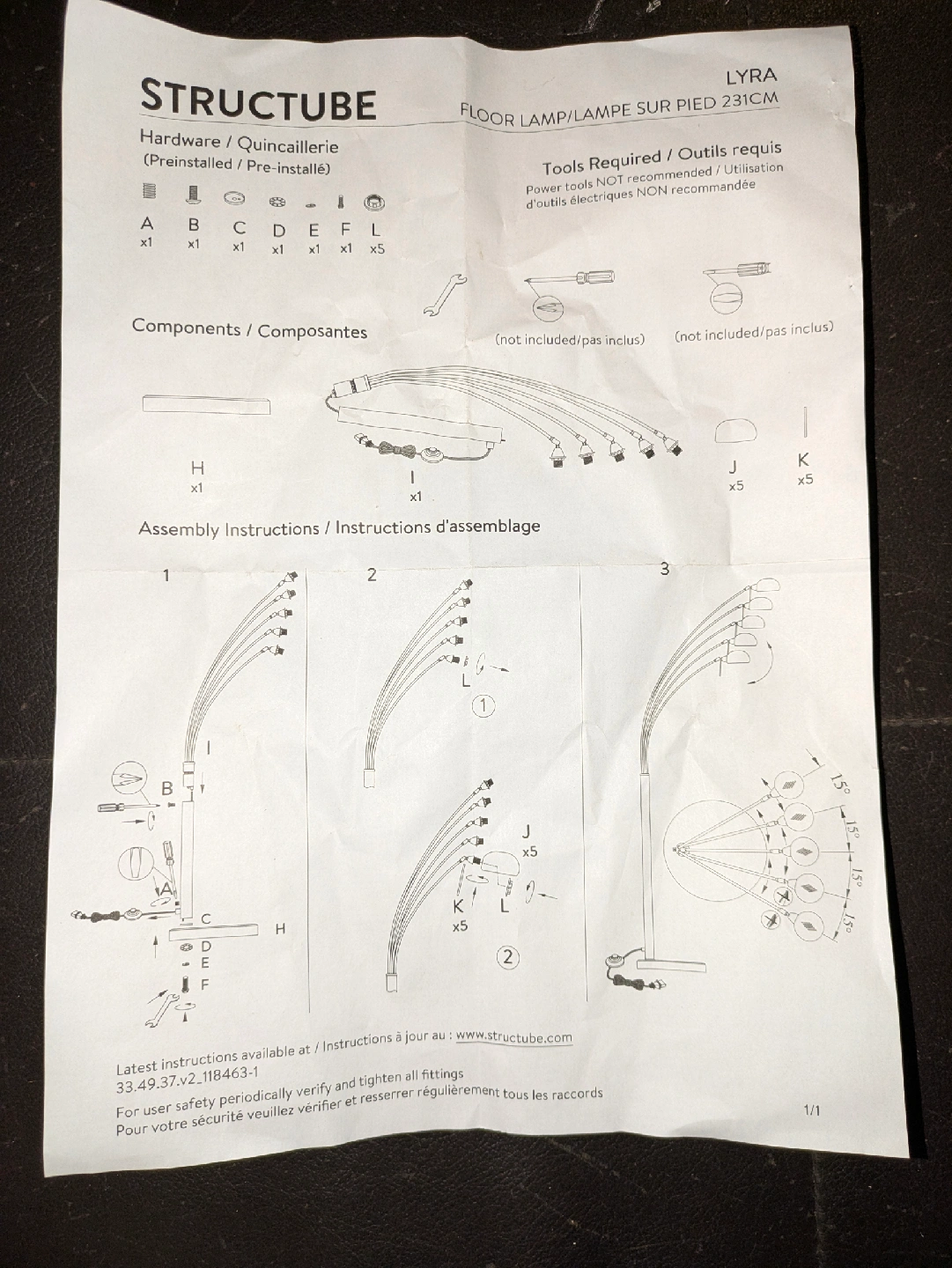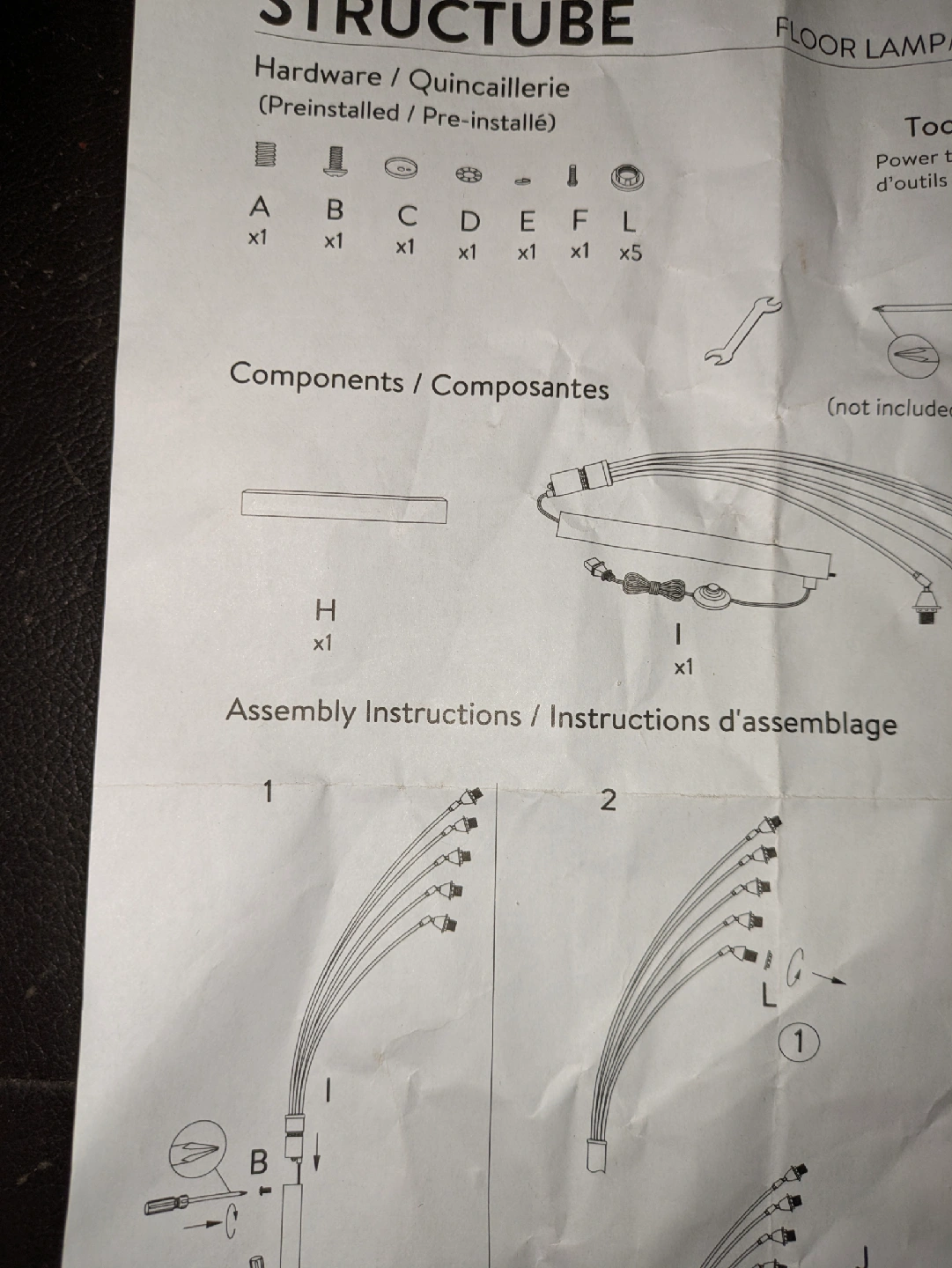 Bought this lamp over two years ago. Moved, and never set it up. Decided to put it together to find the base piece (h) is missing. Can't return or even go to the company. Too lazy to make a new base, so it's free to anyone who'd like to Jimmy rig something up! 😁