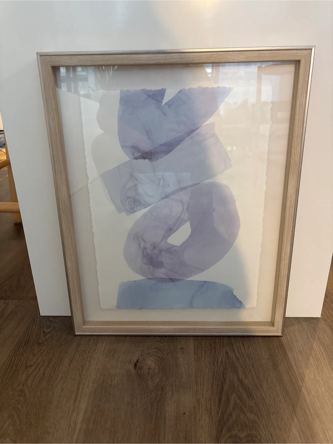 Measures 17”x21”. Framed abstract art print with a calming blue and white design. It's in great condition and ready to add a touch of modern art to your home. Perfect for any room!