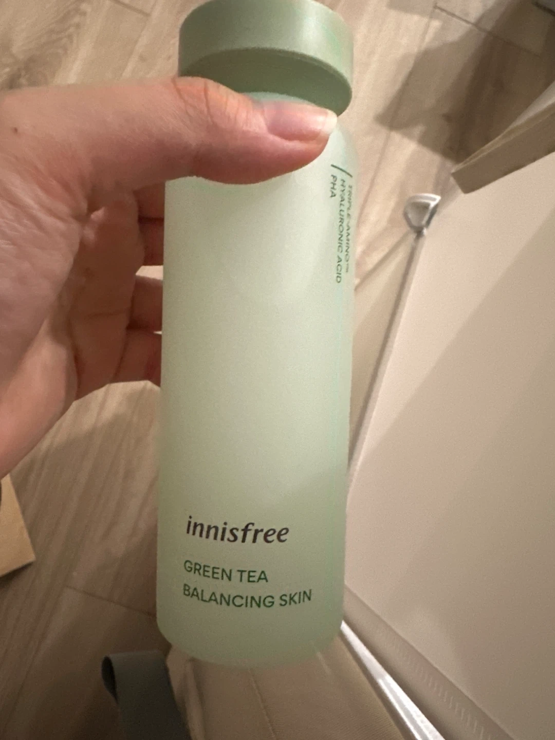 199a bottle of Innisfree Green Tea Balancing Skin. It's a refreshing toner that helps balance your skin. Perfect for adding to your skincare routine