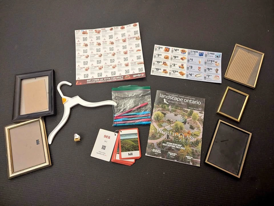 146Coupons from Wendy's and Dairy Queen Baby Coat Hanger 6 Pens - 3 Blue & 3 Pink Landscape Ontario Magazine Mini Crystal Piano (piece broken off the top but still super cute) Toddler Cue Cards 5 Picture Frame - some are old! Over 30 years! 2 Wowbutter Samples Pair of size 9-10 women's slippers Want someone to take all the items at once