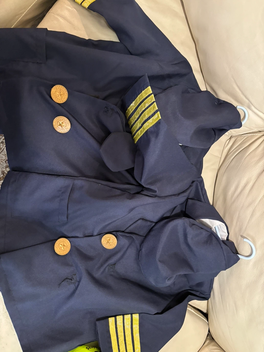 43Giving away two navy blue pilot costumes/dress up. It features gold stripes on the sleeves and decorative gold buttons. Perfect for dress-up or a costume party! Says 3-6 age wise.