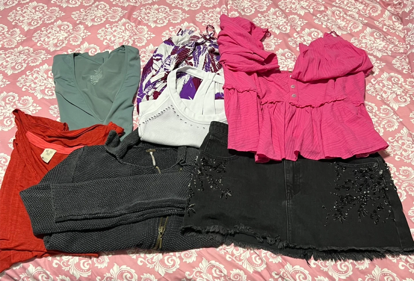 Free People clothing mostly size small but some fits oversized. Two med-large. Individual pictures attached except for black denim mini skirt size 10 and rust coloured oversized tank in size XS. Please ice negotiable. Pick up Midland and Danforth, Scarborough.