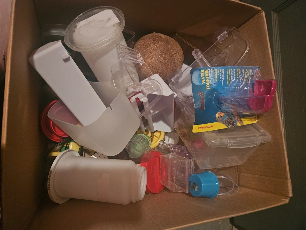 28Selling a collection of bird cage accessories, moatly water dishes and humming bird feeders I bought it off Facebook for $30 I just want it gone now