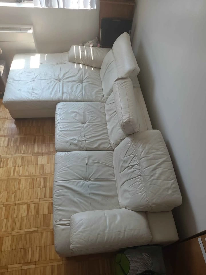80Sectional in downtown Toronto! Quite nice, some wear and tear on upholstery. Ideal for student houses and movie nights! Separates into two pieces. Measurements: 9ft x 5ft (maximum dimensions) The longer section is 38" by 64", and the wider section is 68" by 40" Pick up required.