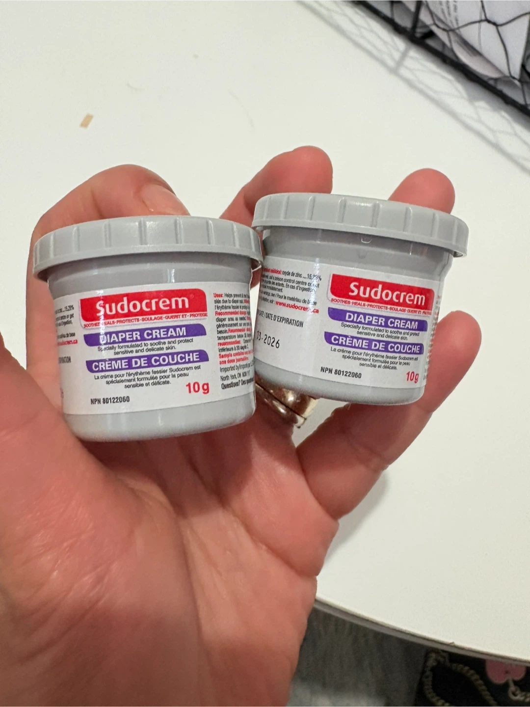 987Two small tubs of Sudocrem diaper cream! Each tub is 10g. The expiry date is March 2026, so you have plenty of time to use them. Perfect for soothing and protecting your baby's delicate skin against diaper rash and irritation