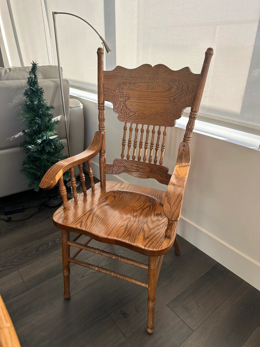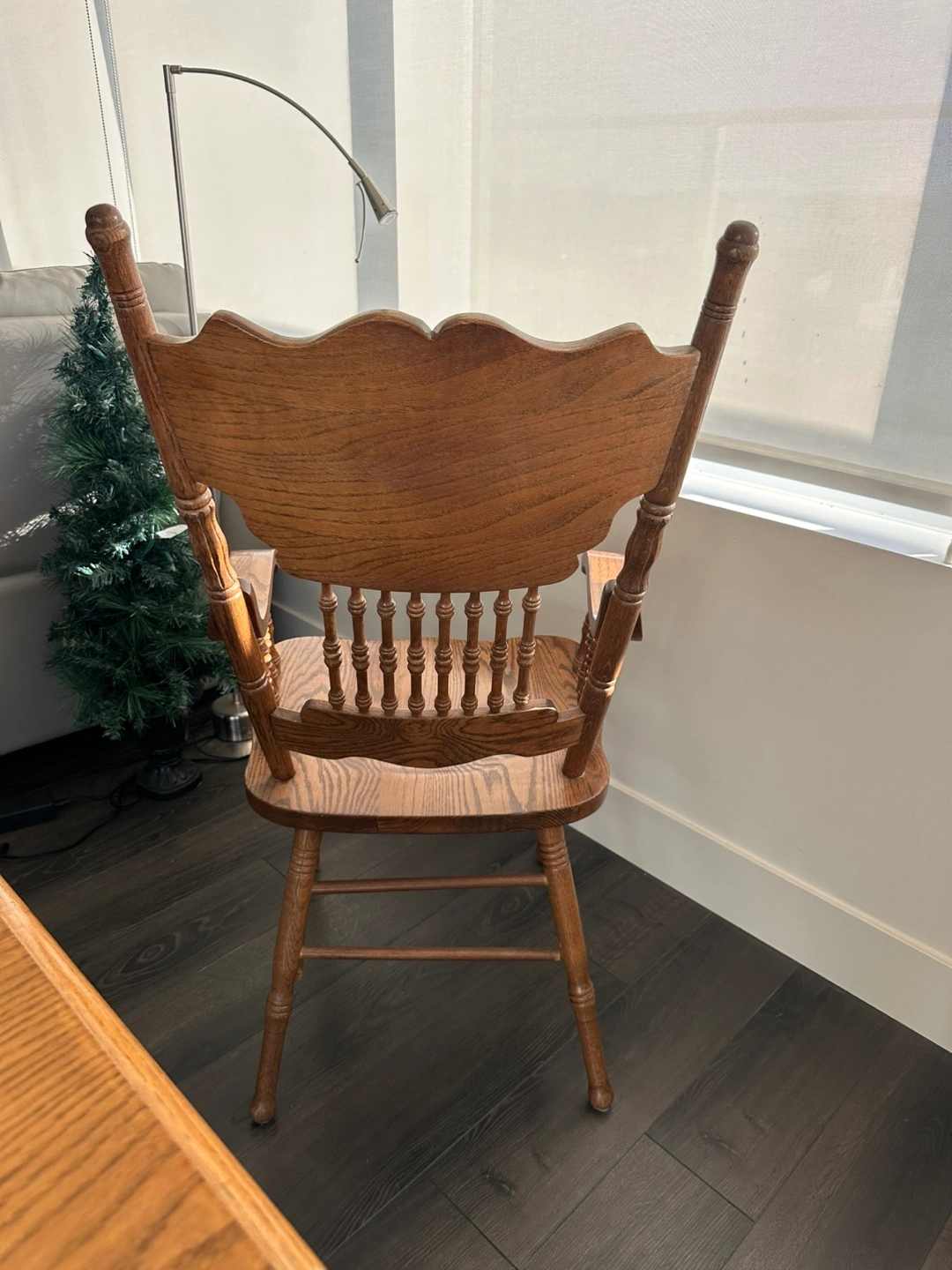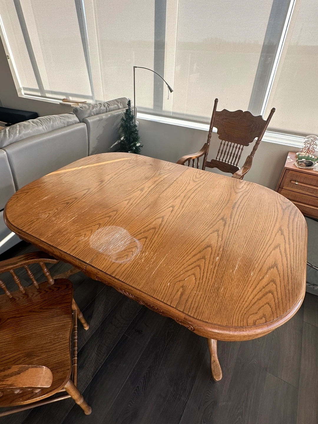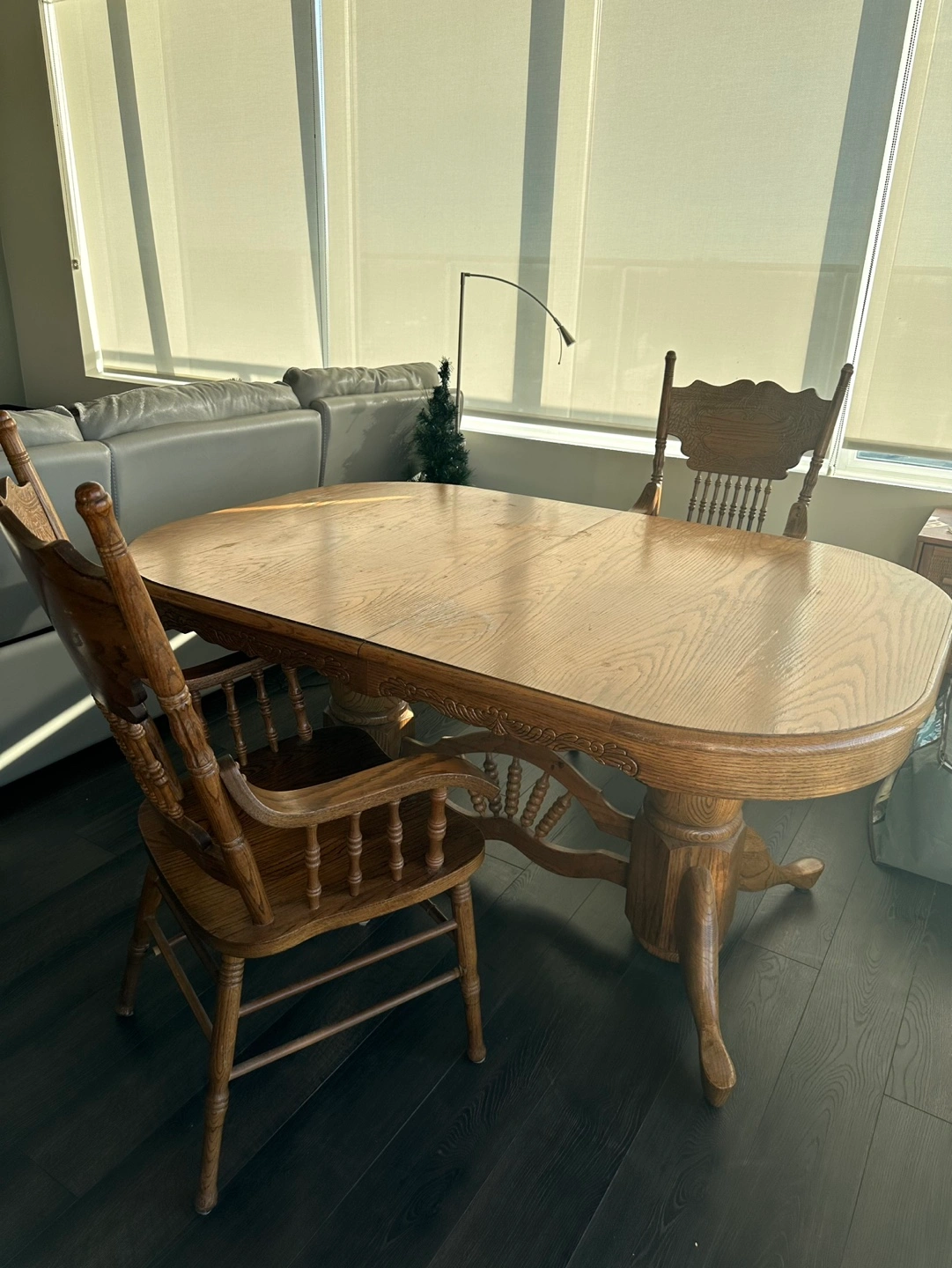 28Solid vintage/ antique wood dining table and four chairs. Table has 2 leaf that extends for extra length. Some wear and tear, see pictures. Great for DIY projects! Free, pick up only, it will need at least two people to carry as the solid wood is heavy. You will also need a trolley or cart to transport out of the apartment building.