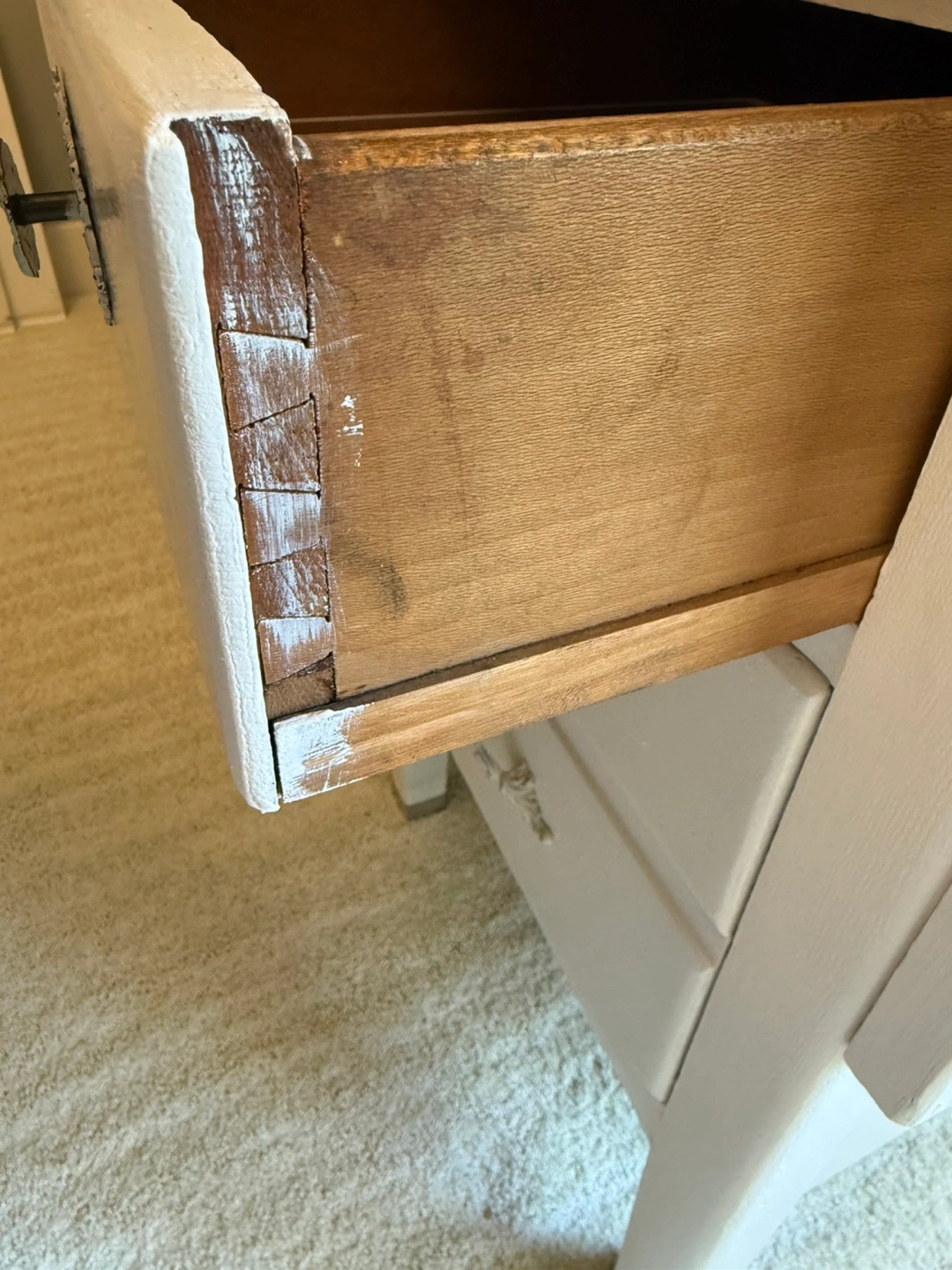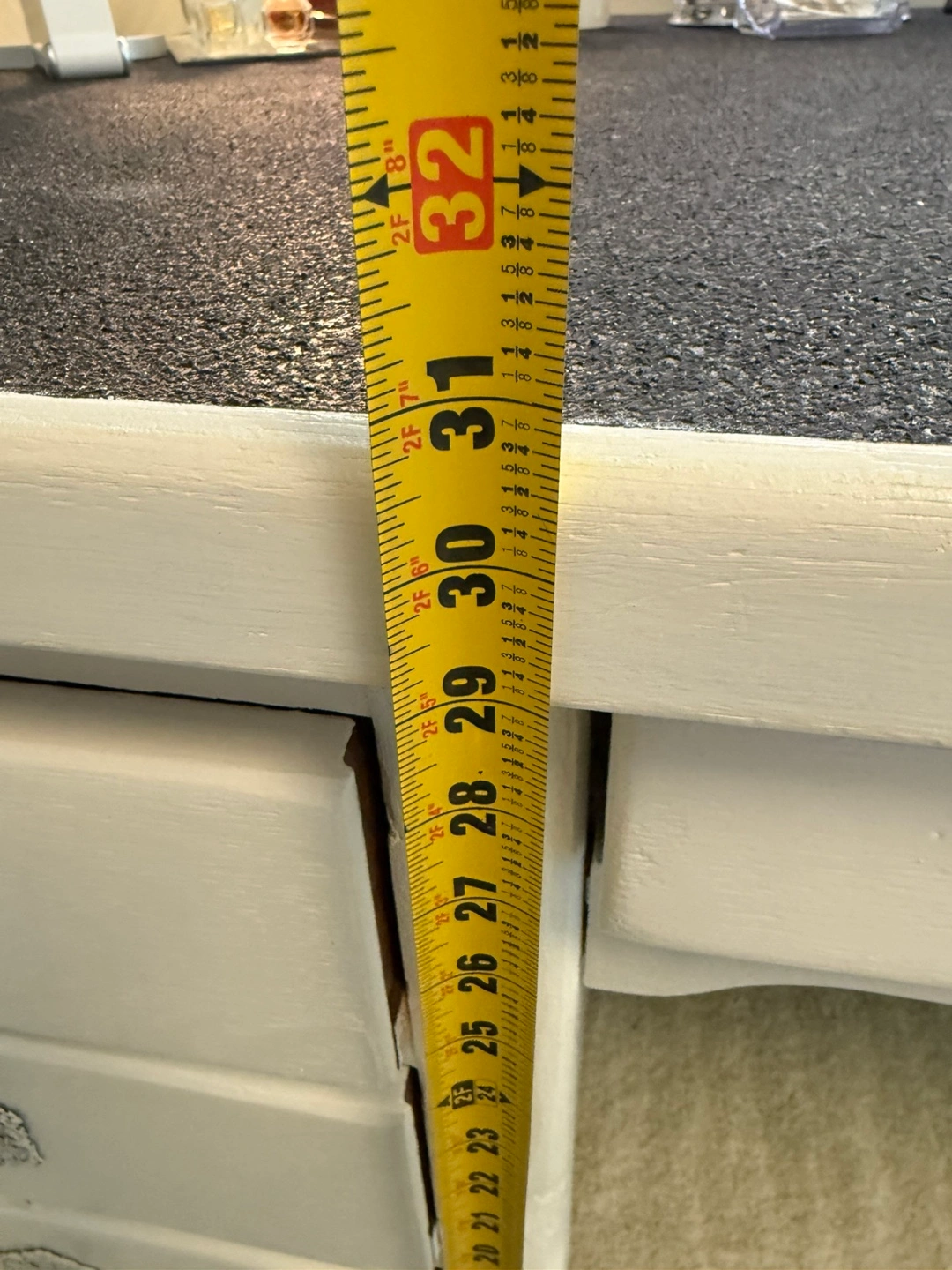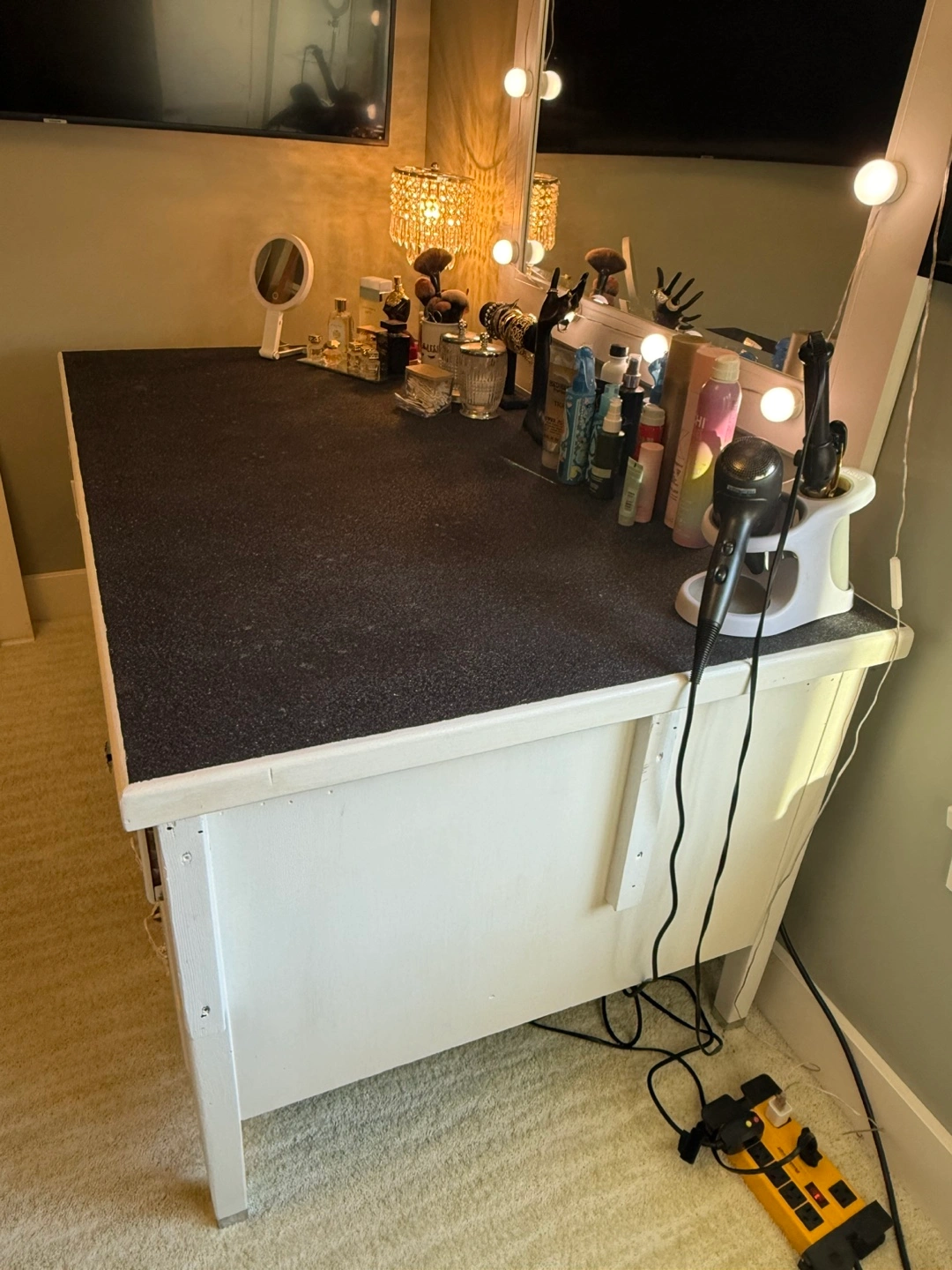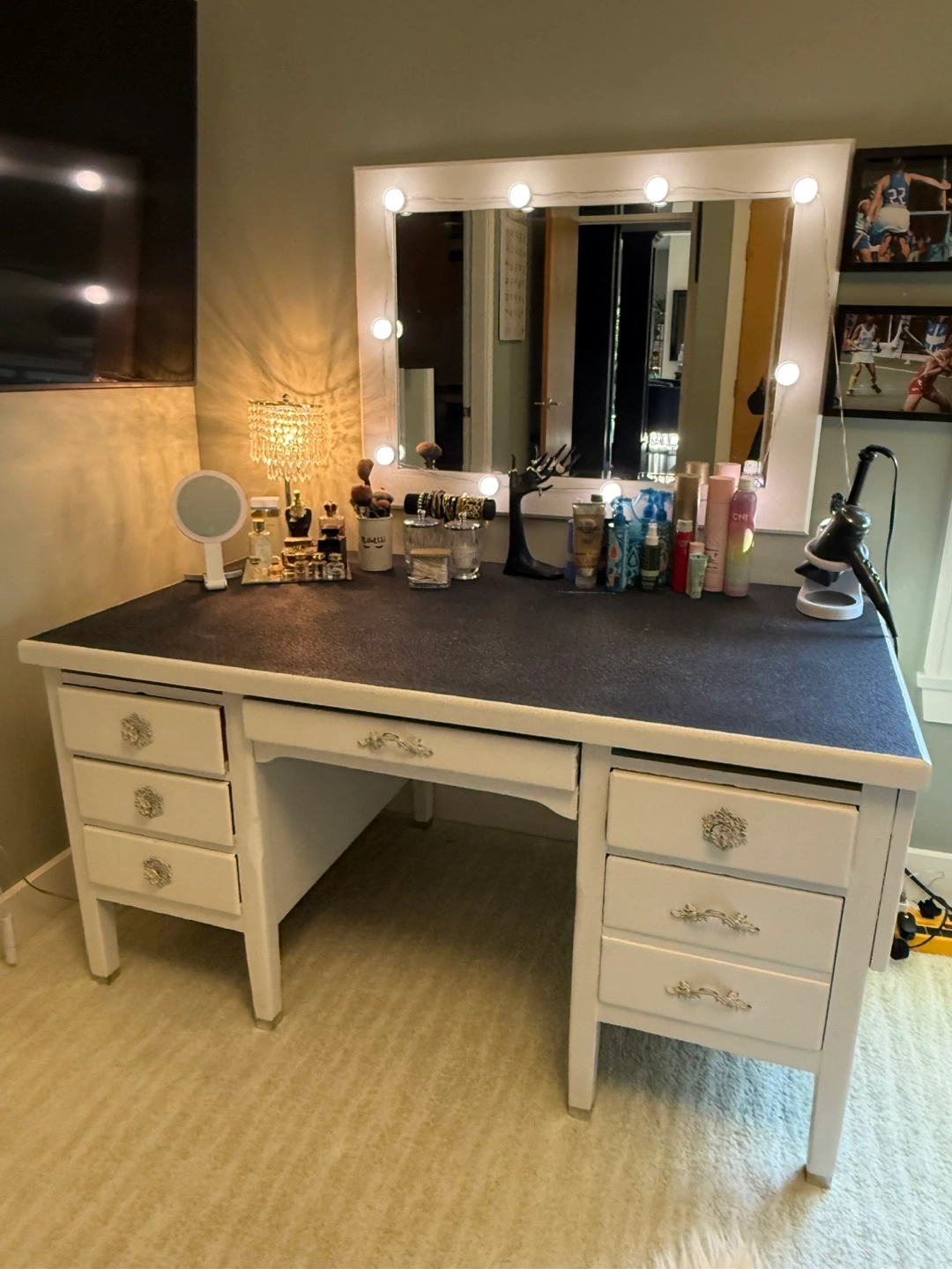 20Vintage-style vanity desk. Six drawers, painted white. Features a black textured top. Approximately 5 feet by 3 feet. Mirror and accessories not included. Just desk. Desk is disassembled for easy move. Excellent desk as a sewing table if the ad is up, it’s available if you’re interested, please inquire. No delivery, you’ll need an SUV at most. I can help load if needed. Cross posted.