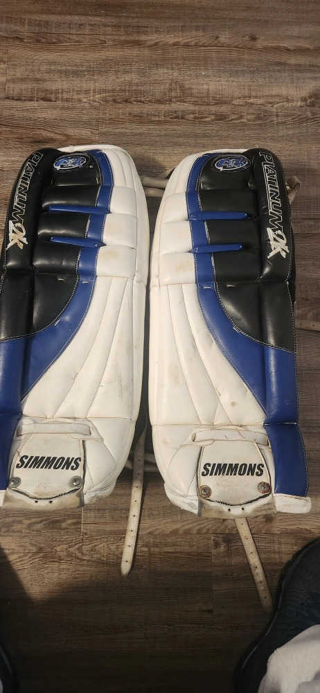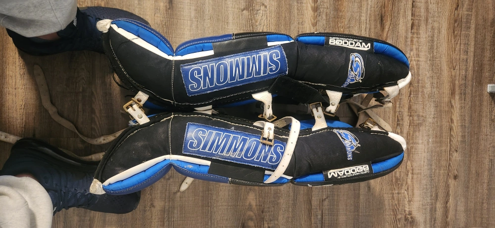 Vintage Simmons goalie pads, blue and black with white accents. In good condition. The pads have a white strap with buckles for adjustment.