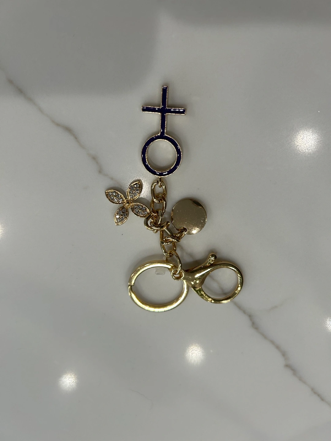 1000+Cute gold tone keychain. Features a Venus symbol charm, small flower charm with rhinestones, and a gold circle charm. Lobster clasp closure.