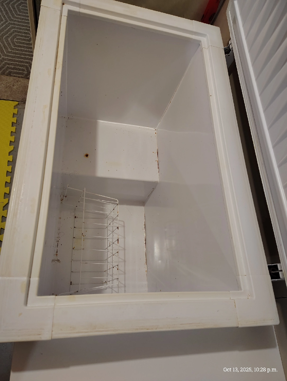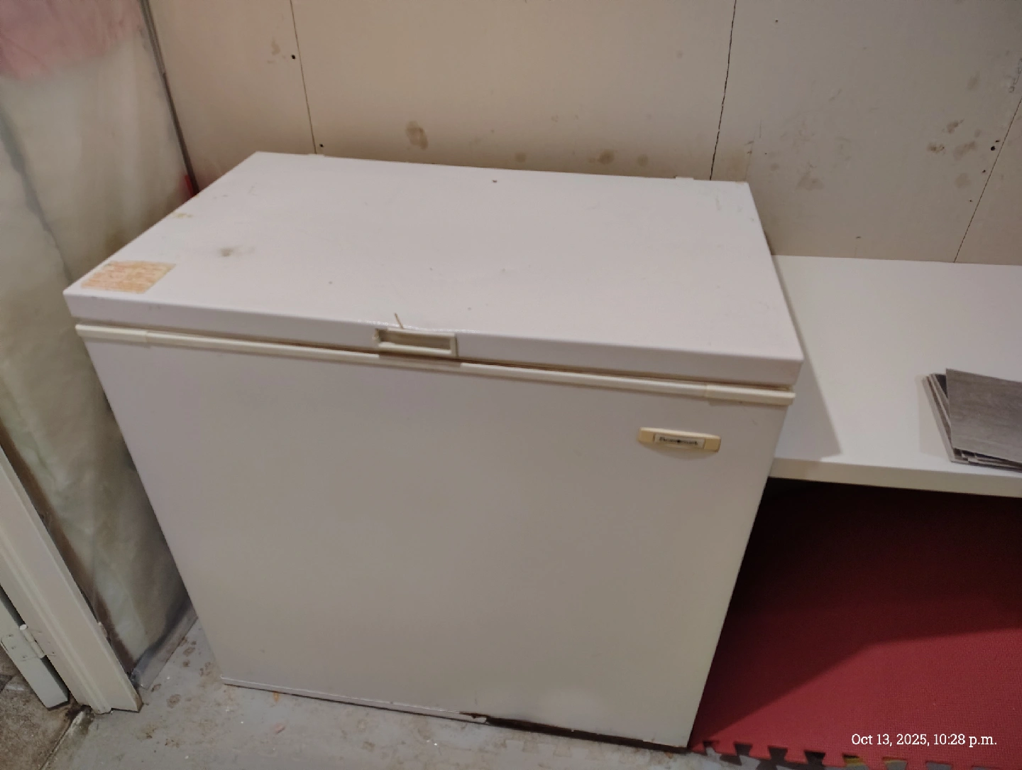 Selling a white chest freezer. It shows some signs of wear and tear. This is sold as-is, and you must remove it yourself from the basement furnace room.