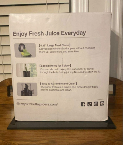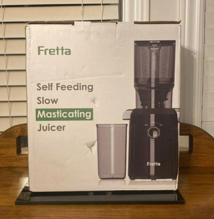 10Brand New Black Fretta Self Feeding Slow Masticating Juicer With 4.25" Large Feed Chute. Model: SJ- 029C. Fits Whole Fruits & Vegetables. Easy Clean. Self Feeding. High Juice Yield, Tritan PCTG BPA-Free. Special Holes for Celery. Easy to Assemble and Clean. 200 Watt Power. For Household Use Only.